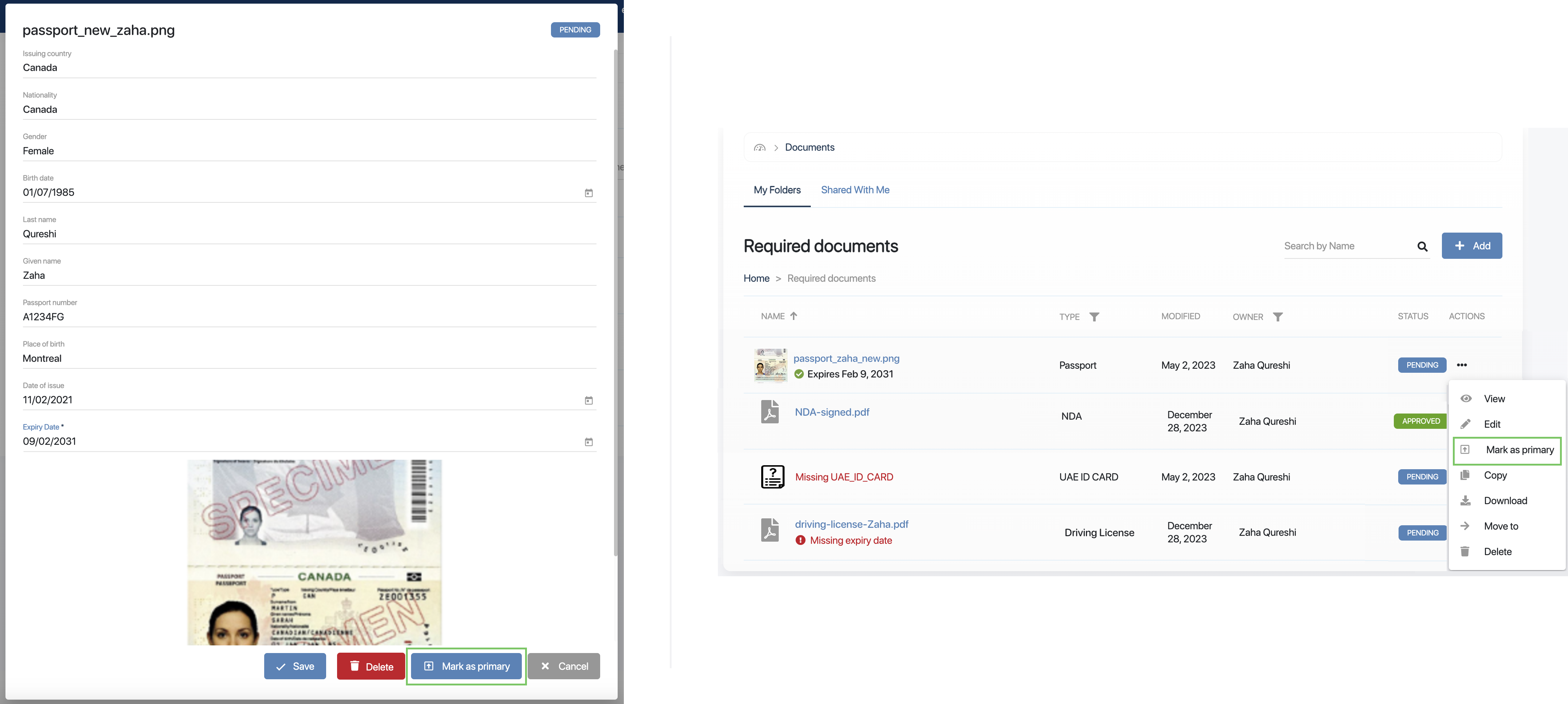 If you have uploaded multiple documents of the same type, you can mark one of them as the primary document that you want your organization to consider for internal records, verification, letters, and other purposes.