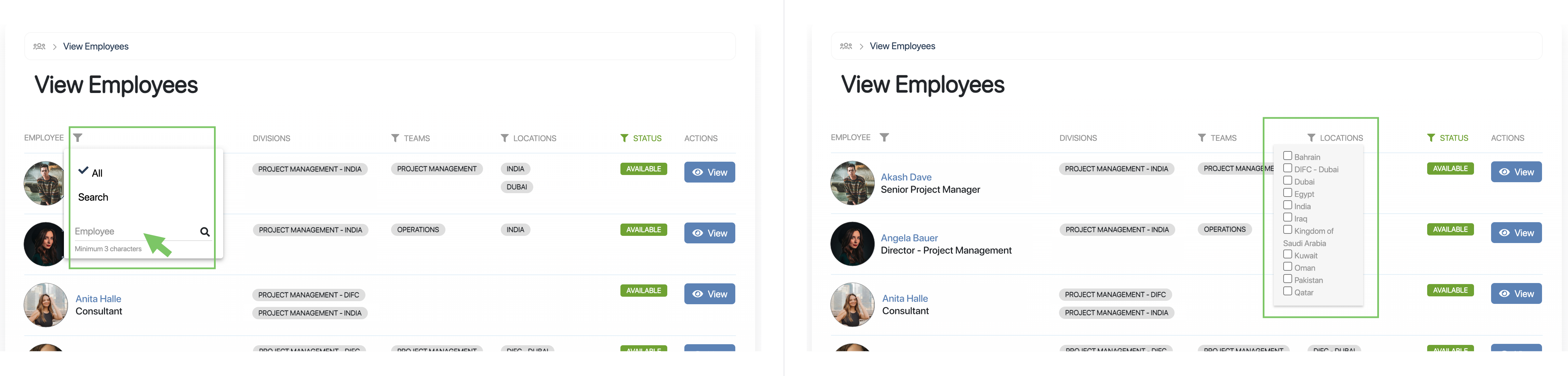 Filter the employee directory by any column (Divisions, Teams, Locations, or Status)
