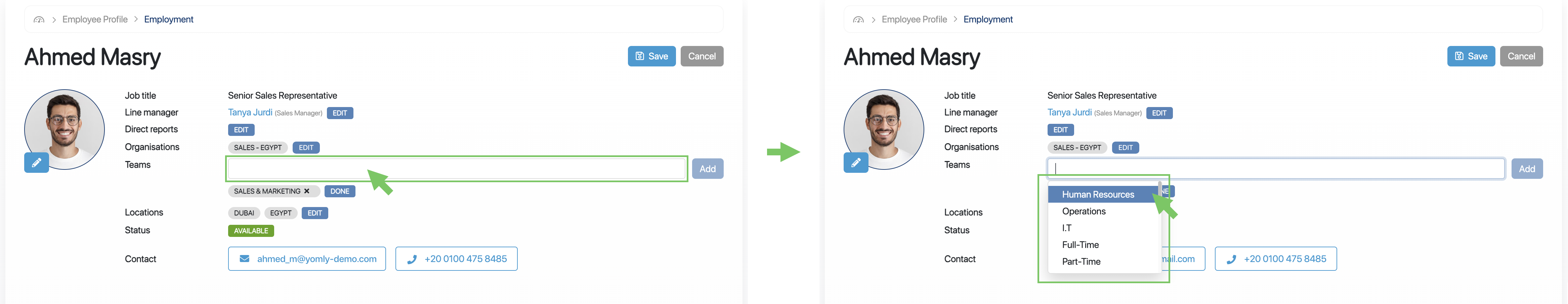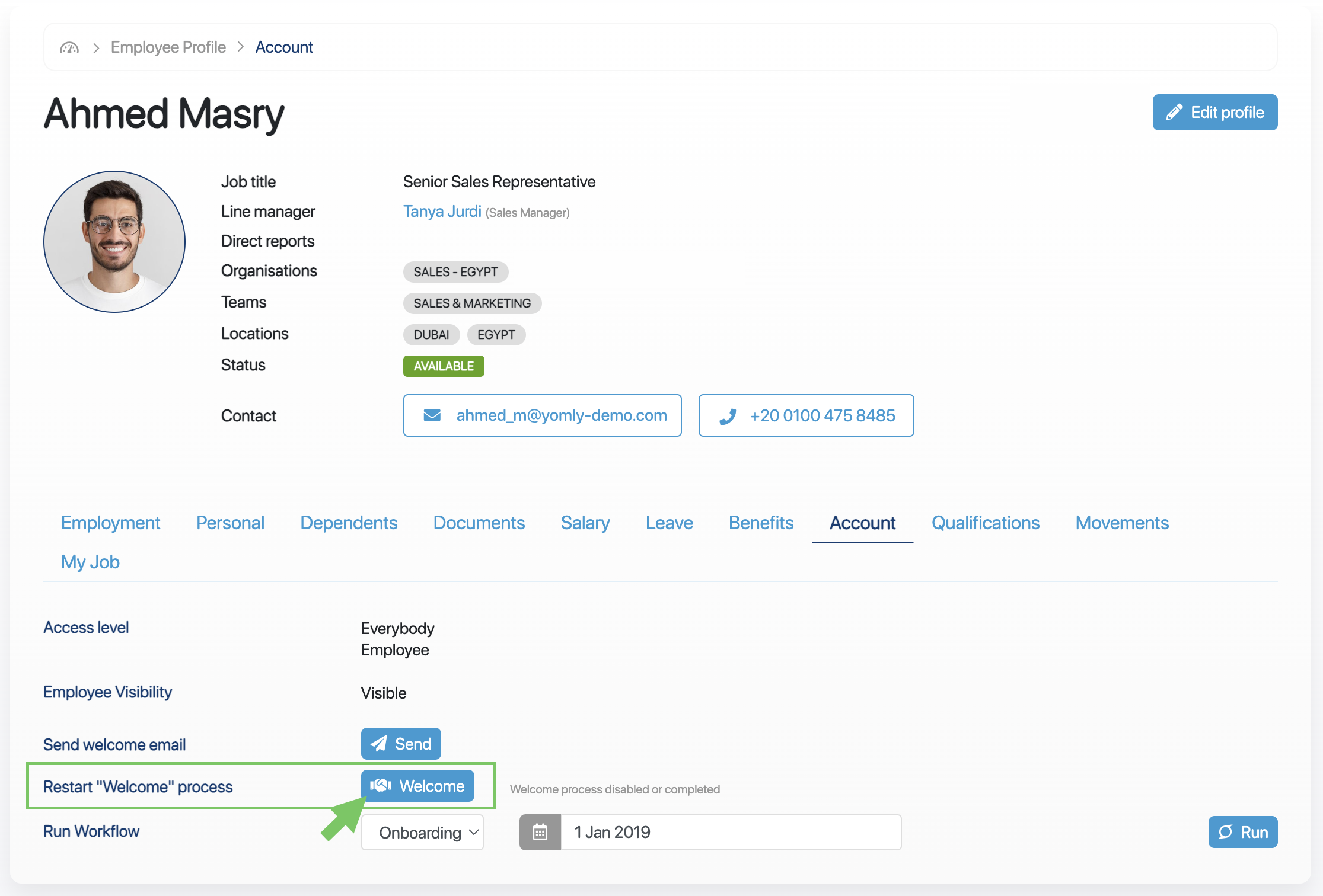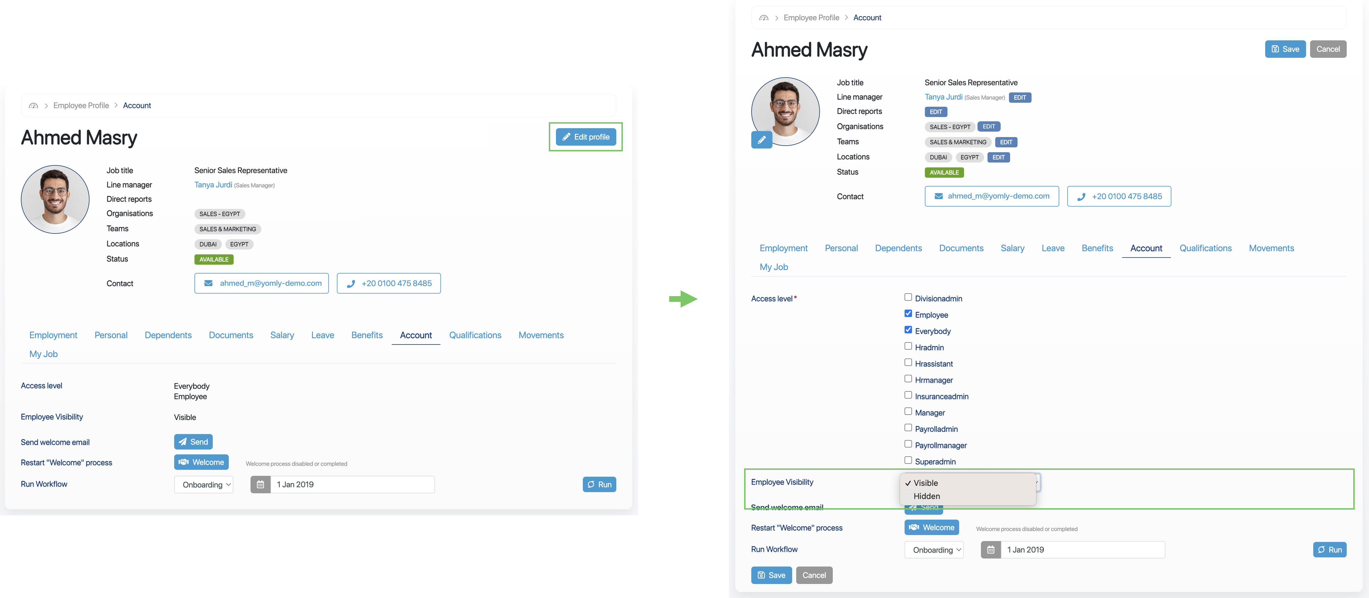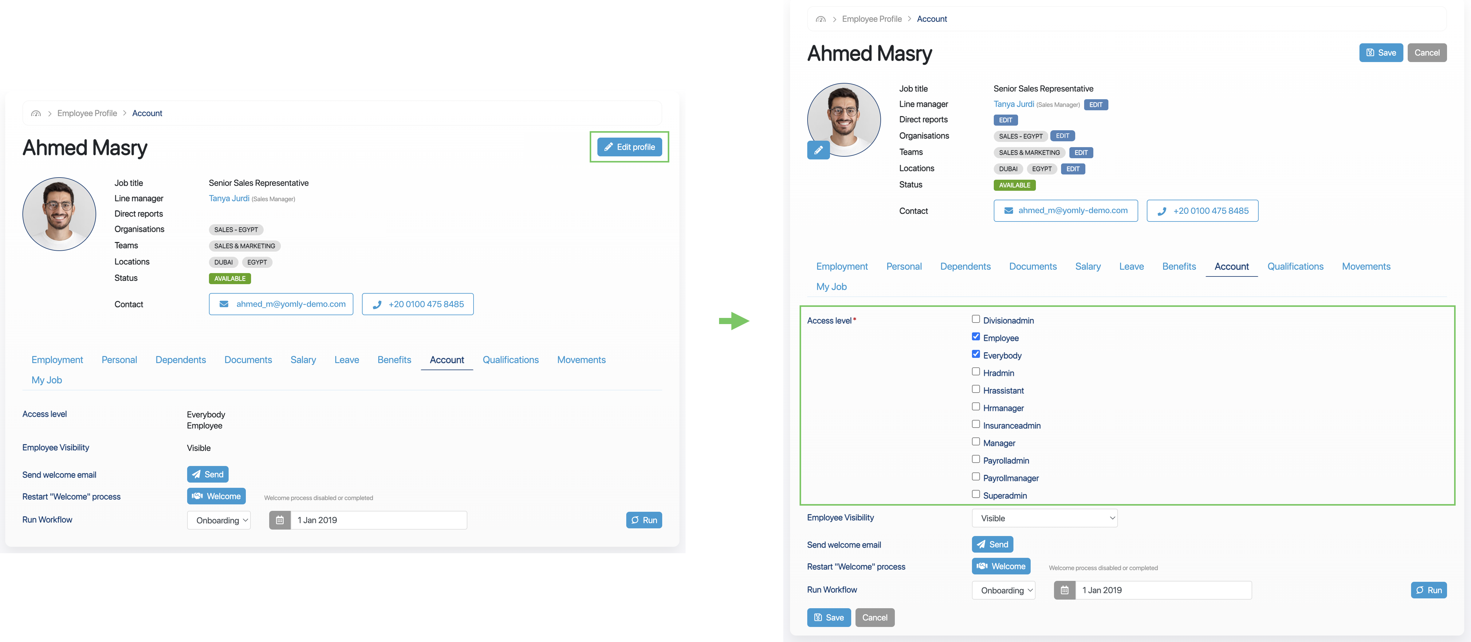Employee profiles contain all information available on Yomly about the employees. This includes both personal details and other information related to working at the organization, such as employees' salaries, benefits, leave requests, career progression within the organization, and even Yomly user account settings.