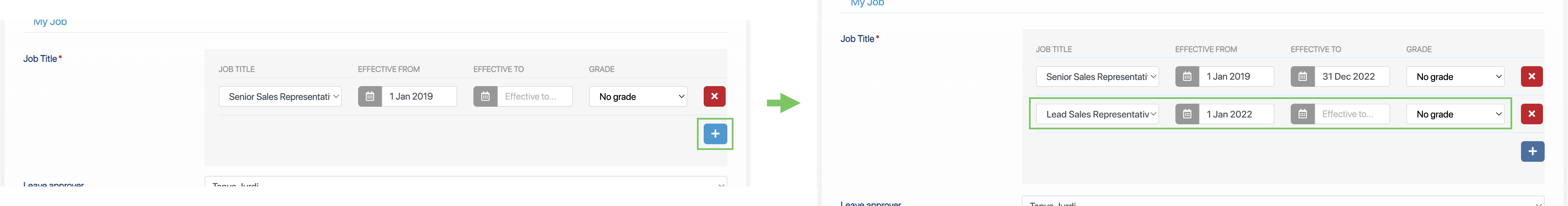 The employee's job title, effective dates, and grade. This field enables you to record the employee's growth within the organization. To add a new job title (for example, if the employee is promoted to a new role), click the Adding a new job title for an employee |