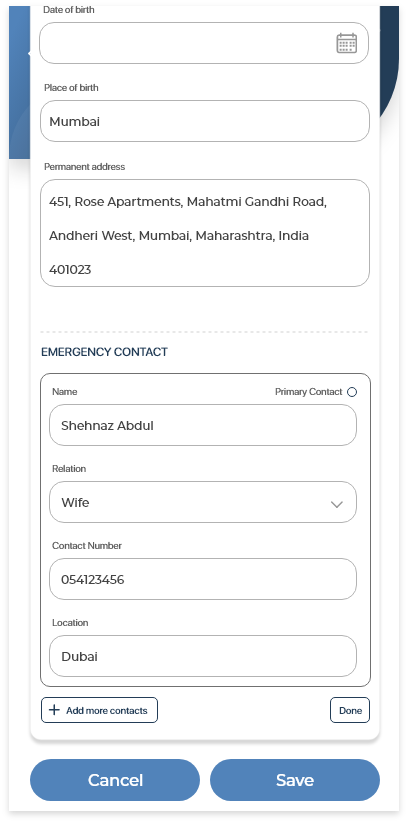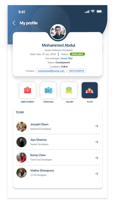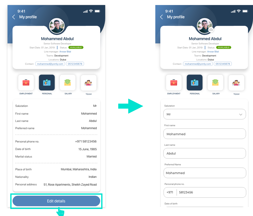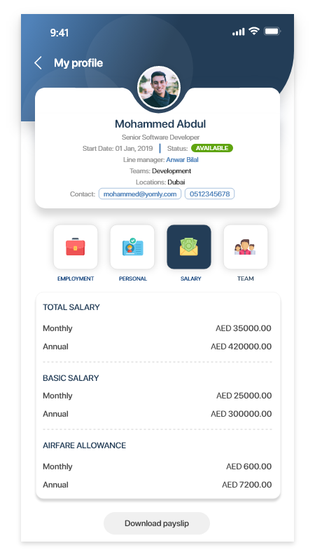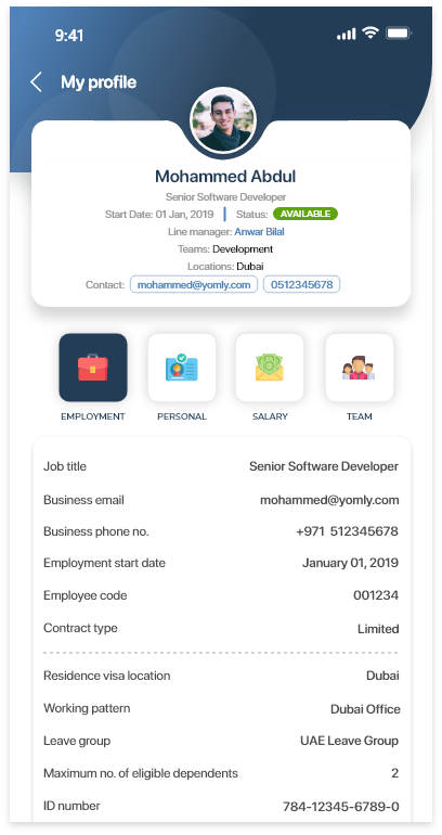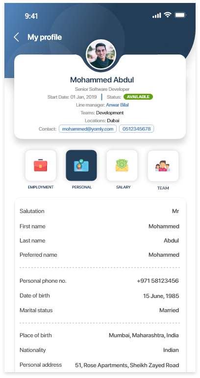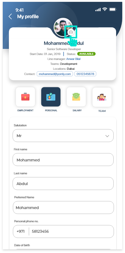 Ability to edit your personal informationYou can edit your own personal information. Ability to add emergency contactsWhen editing your personal information, you can add one or multiple emergency contacts. Ability to change your profile pictureWhen editing your personal information, you can update your profile picture. To do this, tap the Salary