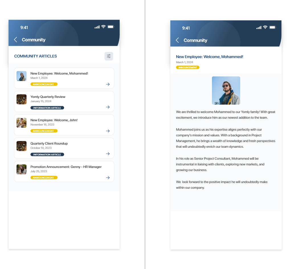 In Community, you can view recent articles posted to your organization's community board. You can filter articles by type (such as announcements, news, offers, and more). |