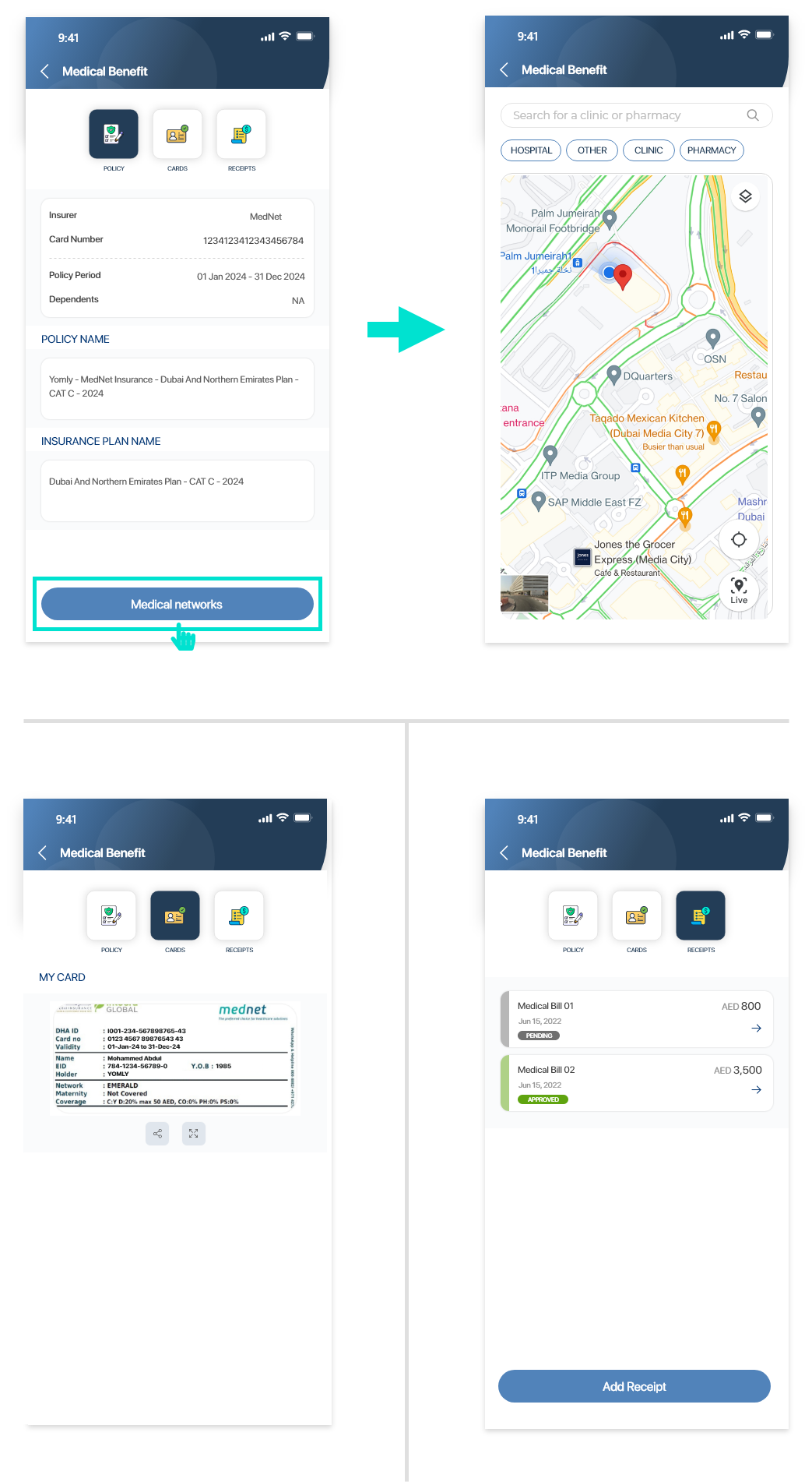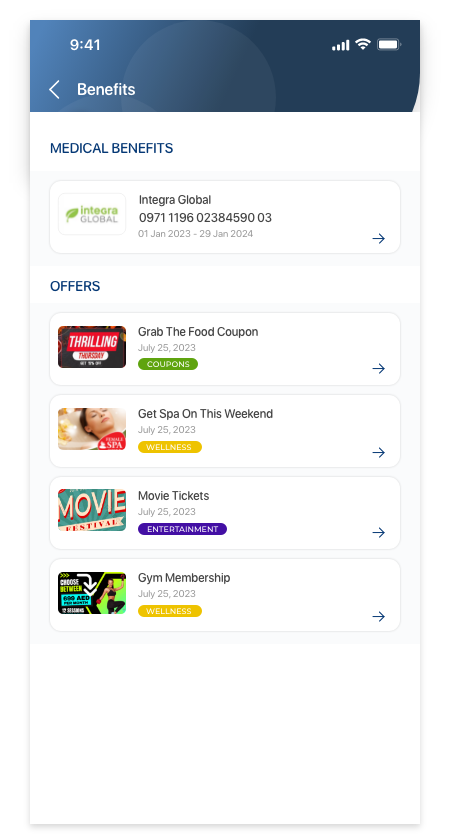 In Benefits, you can view employee benefits provided to you by your organization. You can view the following kinds of benefits: Medical benefits