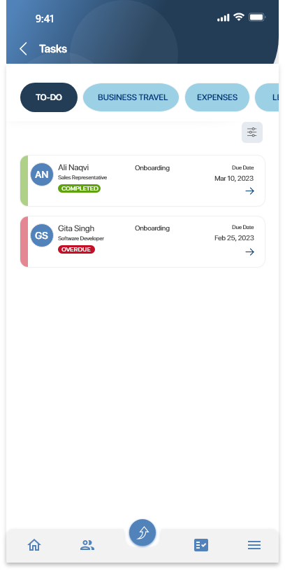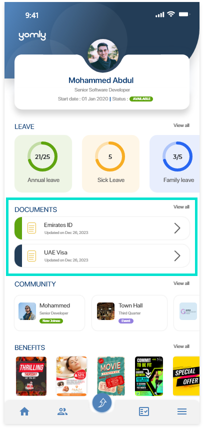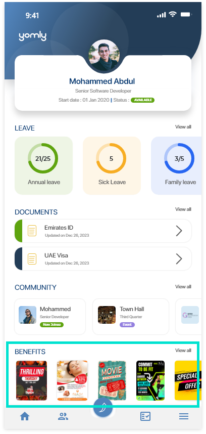 The dashboard is the home screen of the new mobile app. The dashboard summarizes, consolidates, and displays information from different features. This enables you to view their highlights at a glance and stay up to date on the go. From the dashboard, you can quickly and easily navigate to the different features. To do this, on the right of the feature you want to navigate to, tap View all. You can also tap the icon in the tab bar at the bottom of the screen to navigate to different features available in the app. In the tab bar, you can tap the
