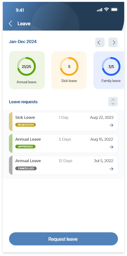 In Leave, you can request leave and manage leave requests. You can do the following: