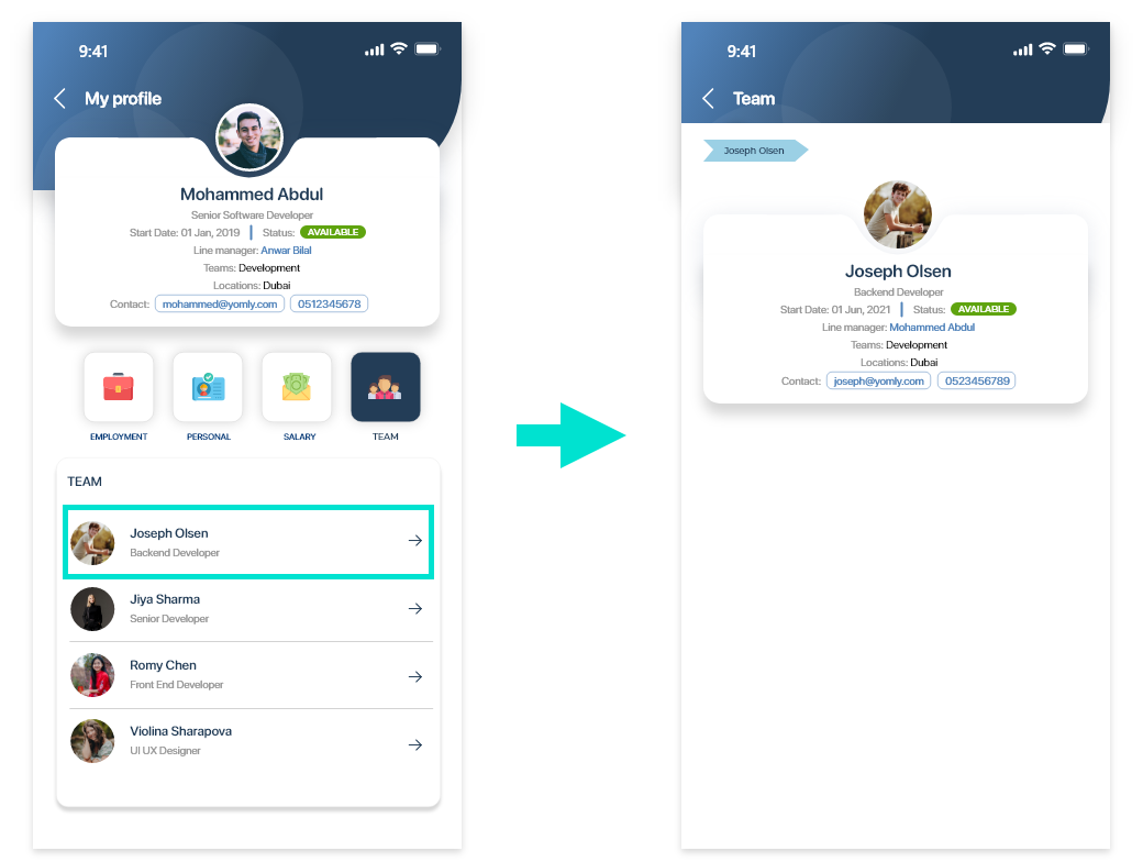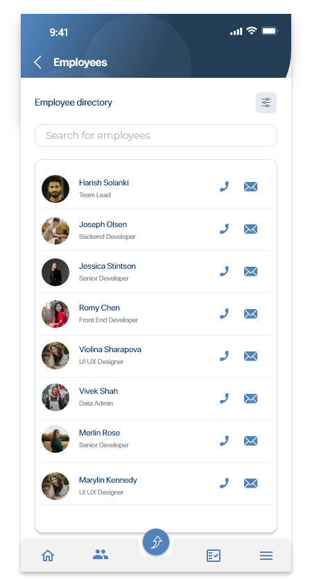 You can view, contact, and navigate to profiles of only employees whose information have access to based on your access level and audience. Simplified navigationTo navigate to your employee directory, tap the |