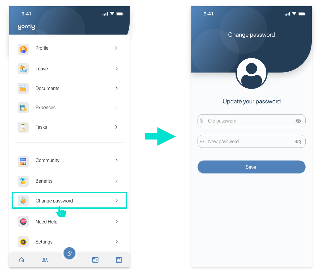 If your organization uses non-federated login methods, you can change the password configured for your own Yomly account even from the mobile app. To do this, on the navigation screen, tap Change password. |
