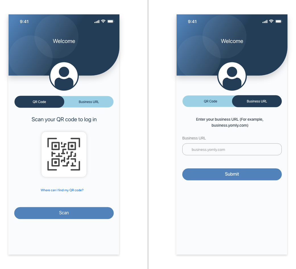 Logging in to the new mobile app is very simple and quick. To log in, you can scan your QR code or enter your business URL. Your personal QR code is is available in your profile in the web app. For detailed information, see the Mobile app login QR code section in this article. If your organization uses simple user authentication, then when you scan you QR code, your business URL and username are automatically filled. You only need to enter your password. Therefore, logging in by scanning your QR code saves you the effort of manually entering most of your credentials. If your organization authenticates users using an external Identity Provider (IdP), then when you scan your QR code or enter your business URL, you are redirected to your federated login screen to complete the login process. After logging in, your access to Yomly is typically uninterrupted. Unless you manually log out, you remain logged in and are automatically re-authenticated when required. Account activation through loginAs a new Yomly user, you can even activate your account by logging in to the new mobile app. Your account activation email contains your personal QR code, which you can scan to log in. If your organization uses non-federated login, your initial password, which is encoded in your QR code, is auto-filled in the login screen. After activating your account, you can change your password based on your preferences and your company's password security requirements. For more information |