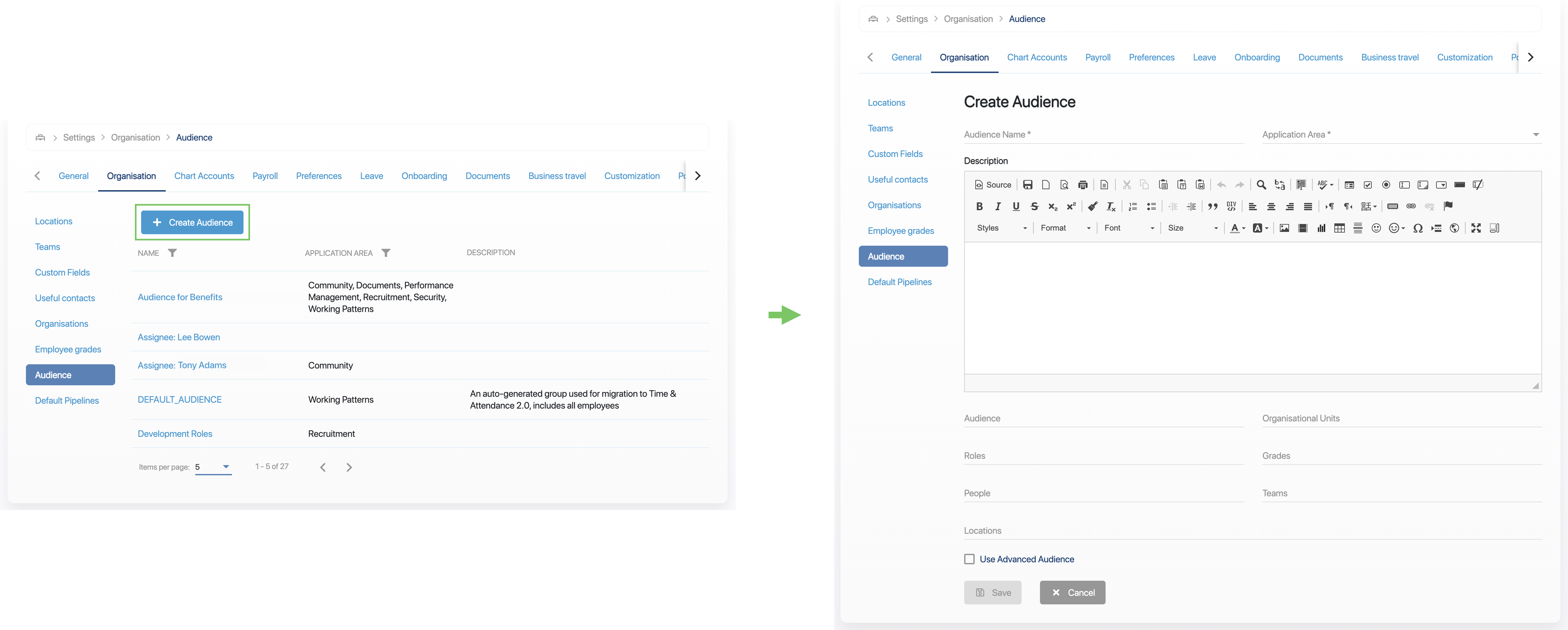 Audiences are dynamic. This means that after you define an audience, the list of grouped employees updates automatically to reflect movements, such as promotions and transfers, within the organization and changes to employee information.
