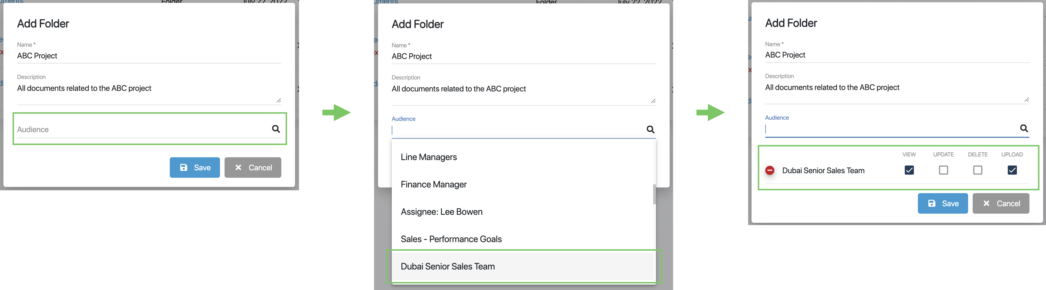 After setting up permissions for a folder, you can simply upload documents to it to share them with only audiences with access to the folder.