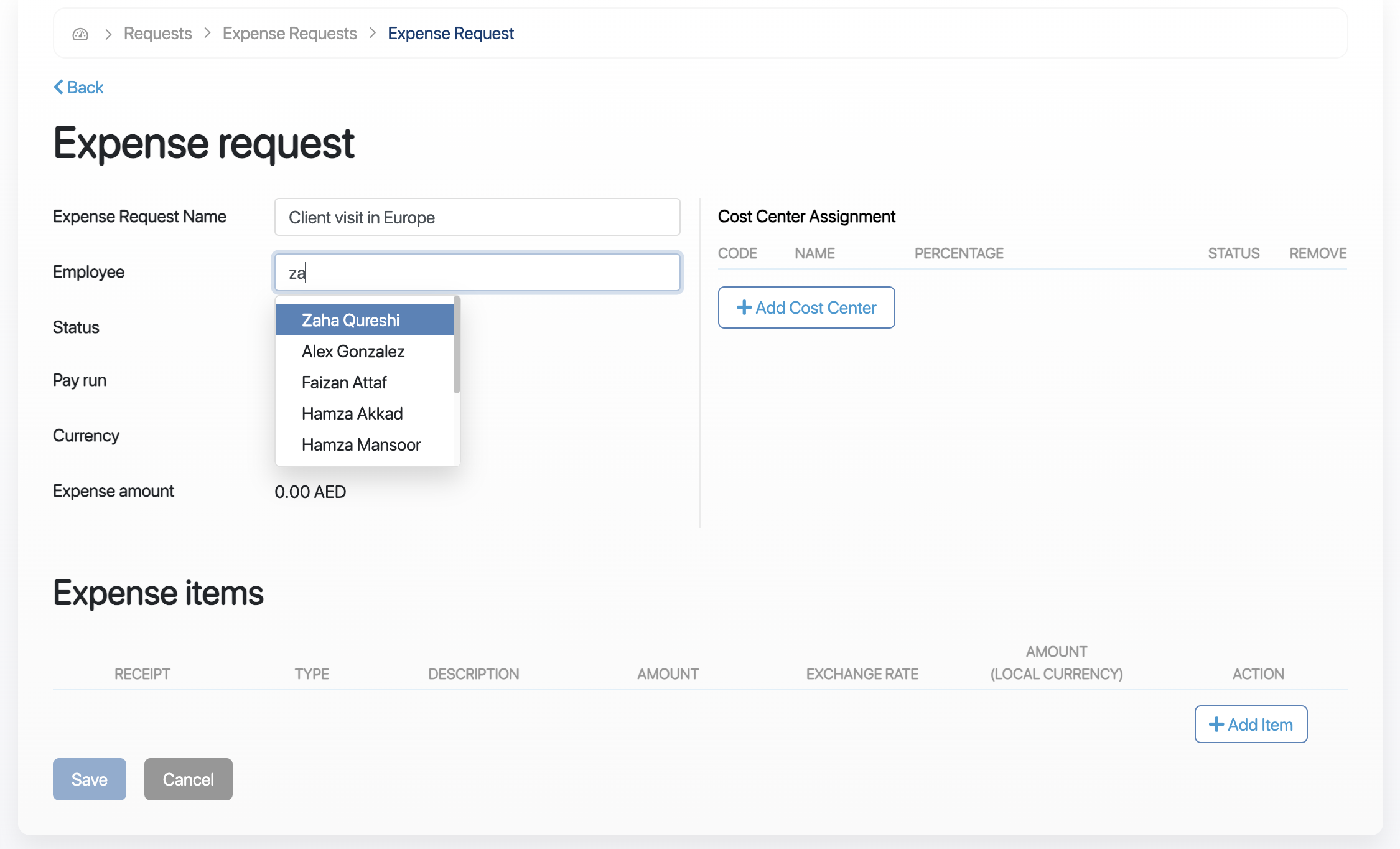 (Optional) Assign the expense request to one or multiple cost centres.