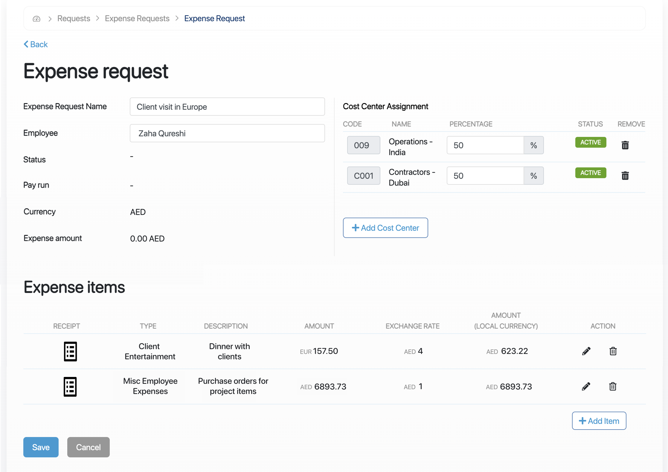 The expense request is saved in its initial state (Draft). At this stage, if required, you can still revisit and edit the expense request. When you finish making changes, you can submit the request for approval.