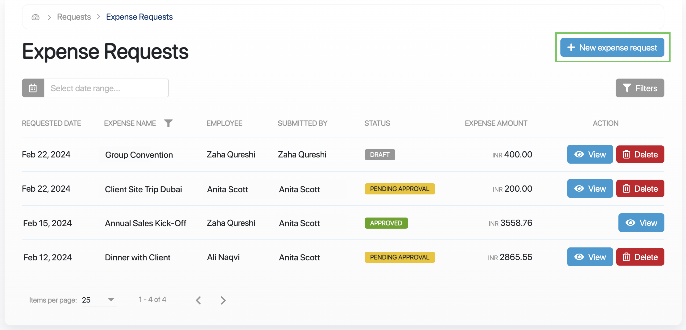 In the upper-right corner of the Expense Requests page, click + New expense request.