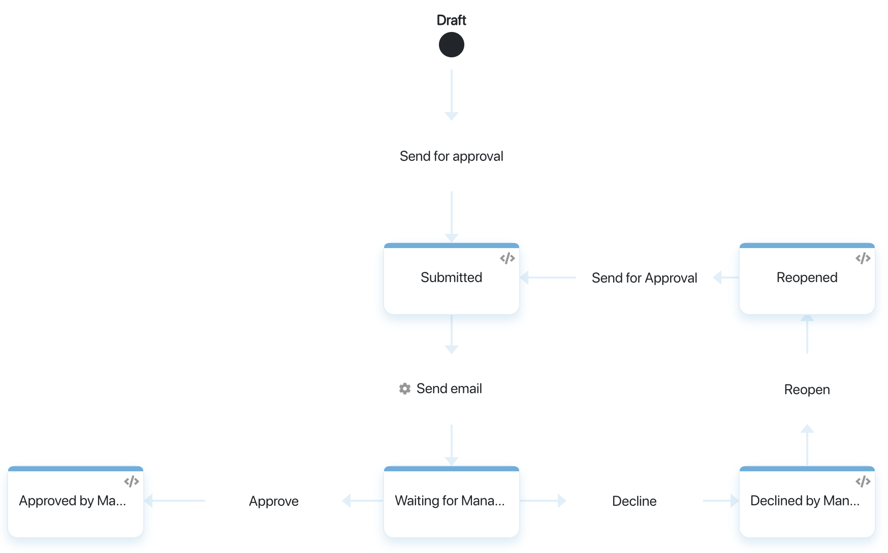 The following example illustrates a typical expense approval workflow that can be implemented through the pipeline.