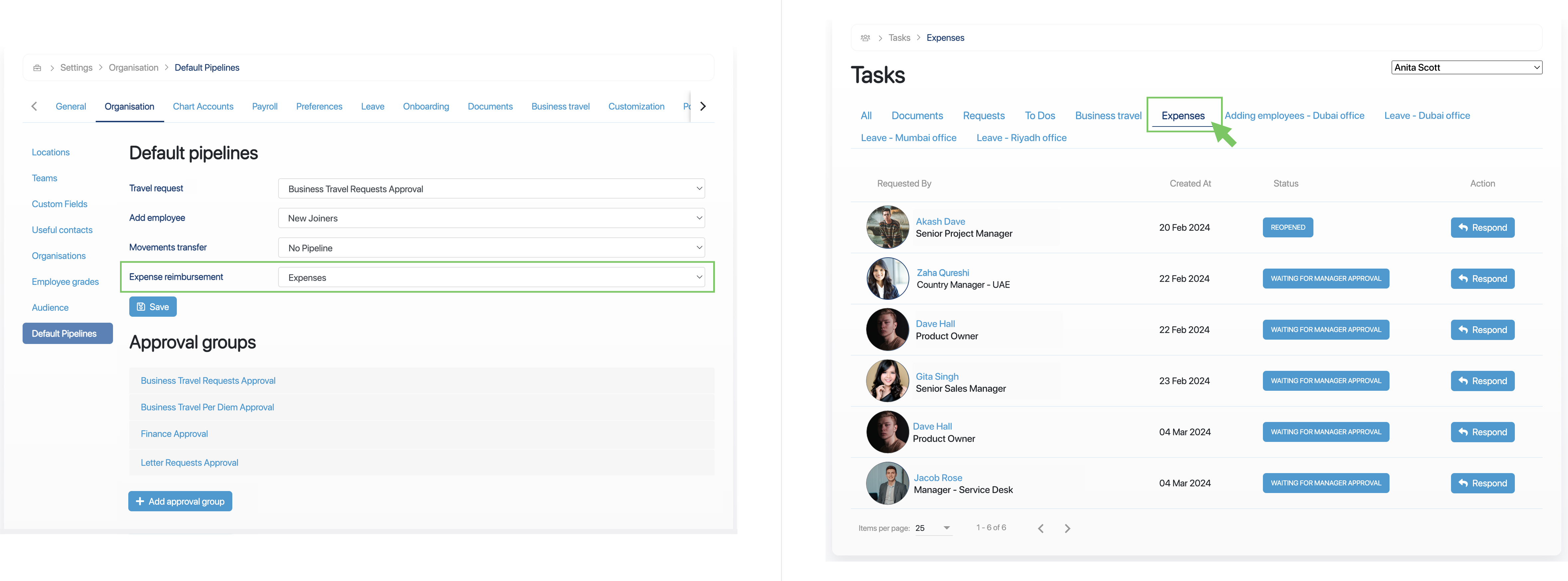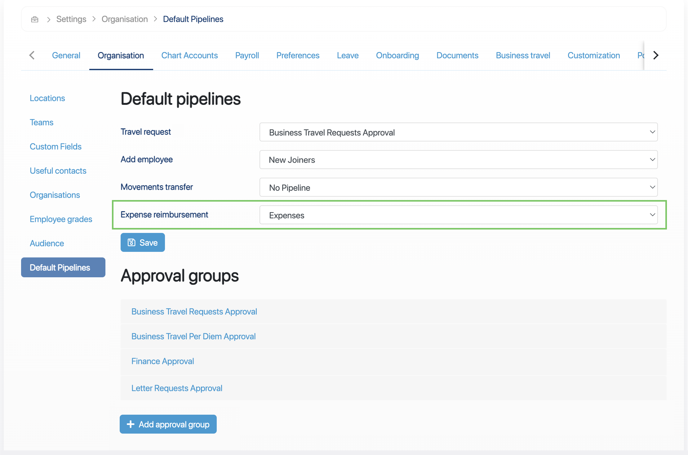 - How to configure the default pipeline for expense approval