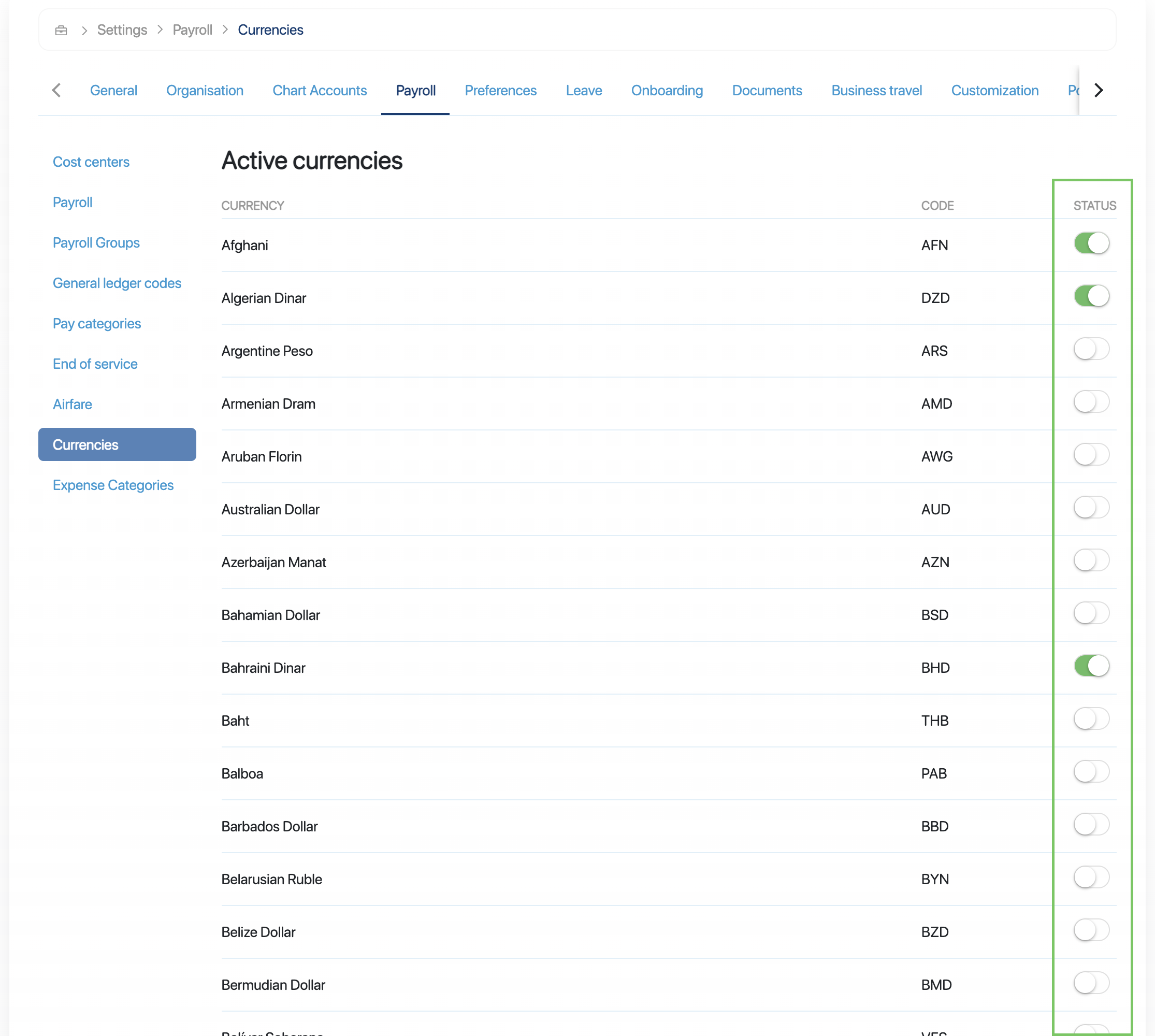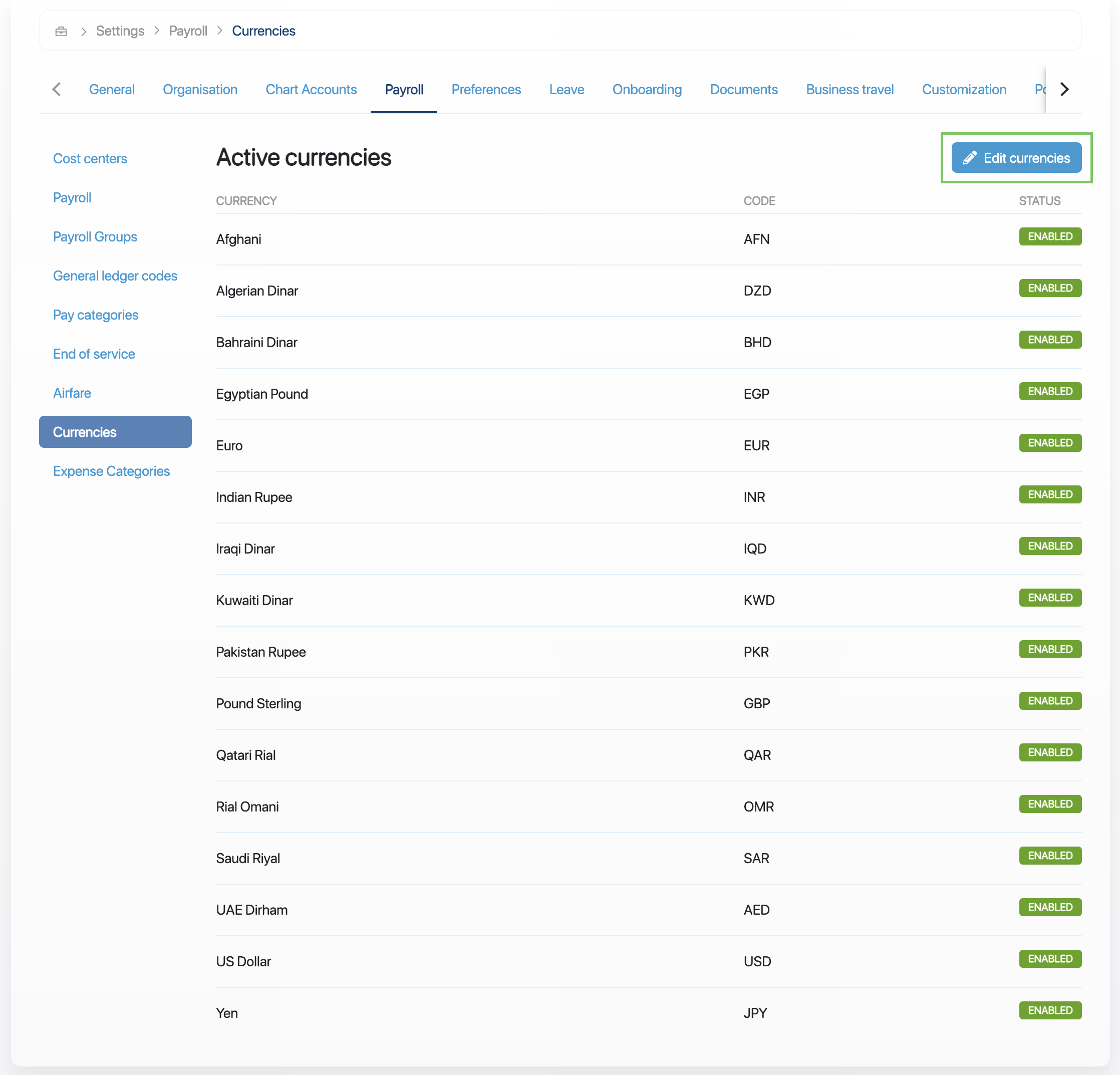 Platform and payroll admins can enable the currencies that employees can reimburse expenses in from the business payroll settings. To enable a currency, you can do the following: