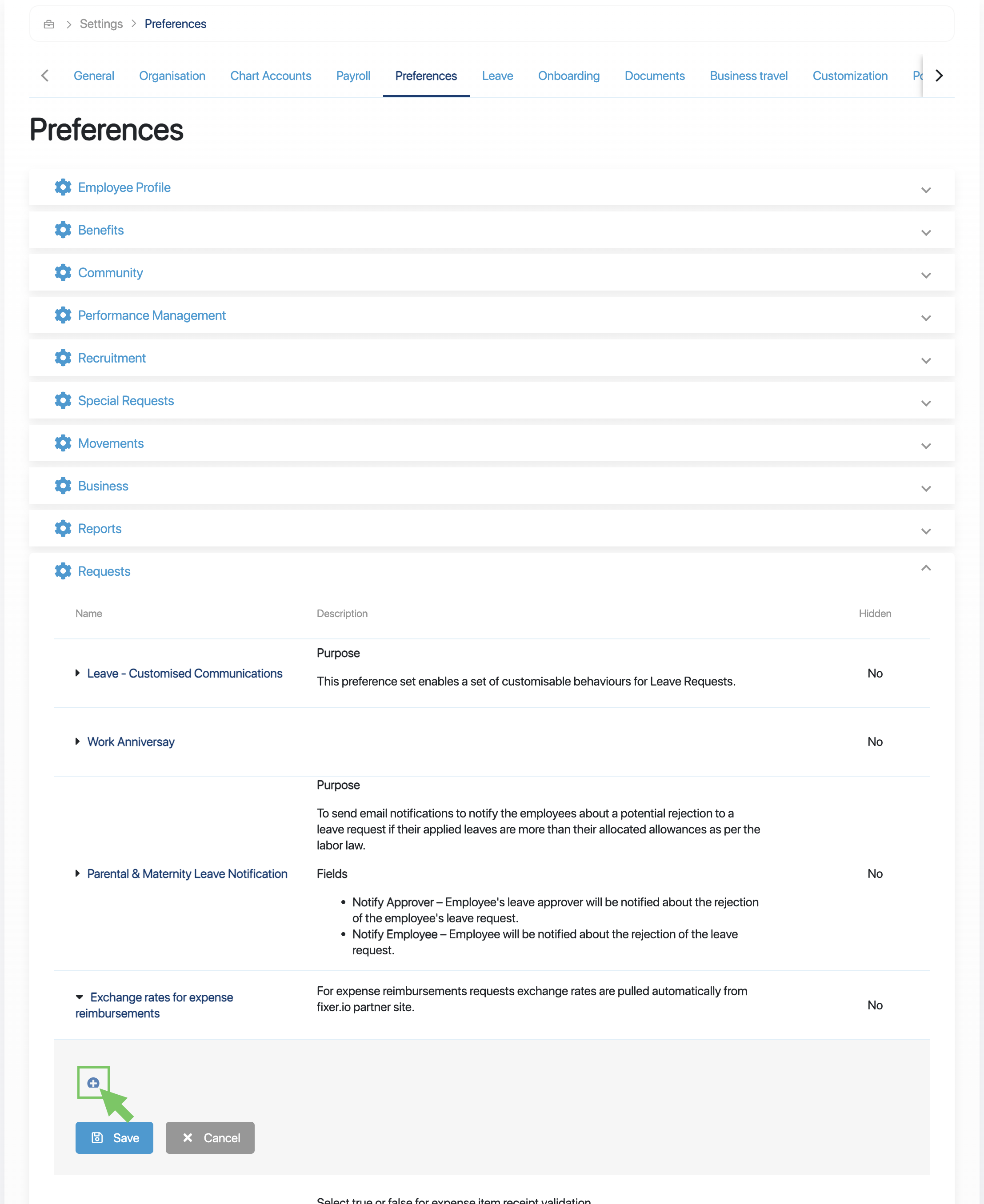 However, as a platform admin, you can configure a custom exchange rate for any currency. You can do this by customizing the Exchange rates for expense reimbursements preference (available in Requests preferences) from your business settings. Do the following: