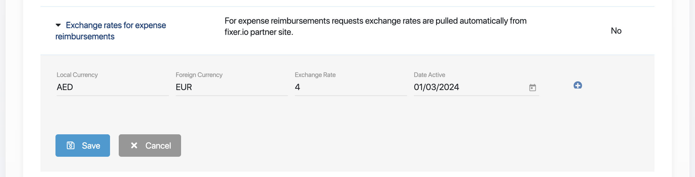 Field Description Local Currency Currency that the amount needs to be converted into Foreign Currency Expense currency Exchange Rate Your custom exchange rate Date Active Date that the custom exchange rate is effective from Sample custom exchange rate