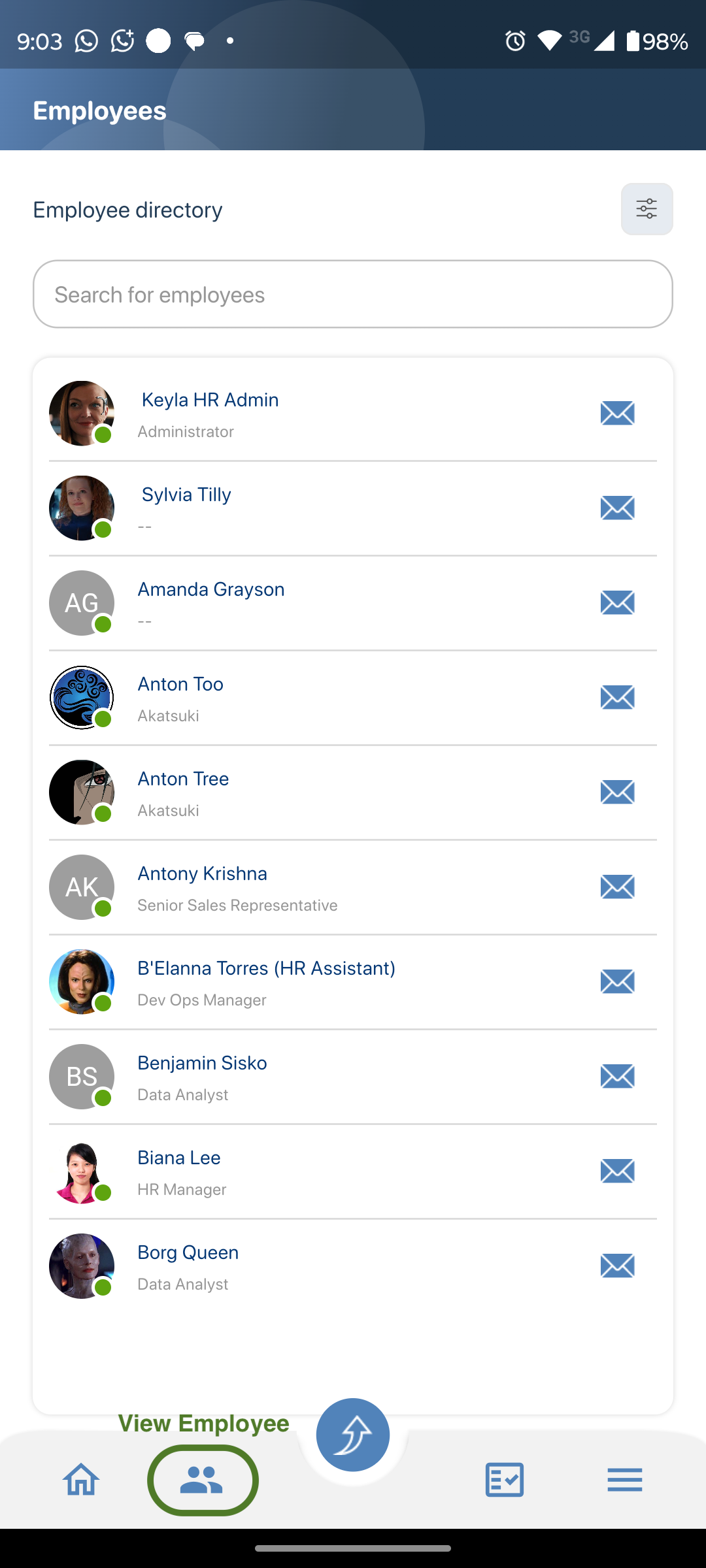 - This will display a list of employees, based on the visibility restrictions set by your Business.