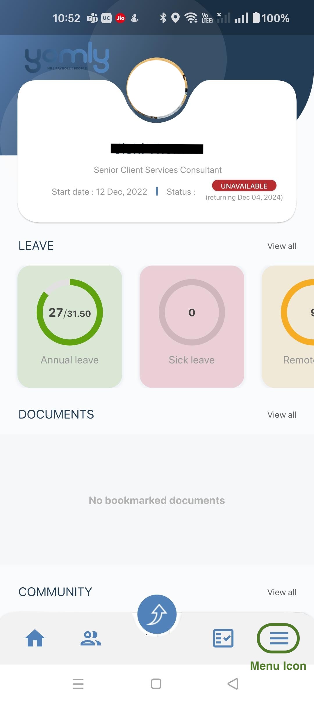 - On the Yomly App home screen, tap the menu icon (three dashes) located in the lower right-hand corner.