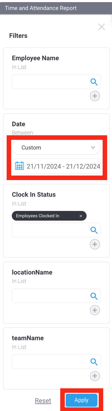 - In the filter options, set the filter option you want (In this sample we want the clocking report from November 21, 2024 to December 21, 2024.)