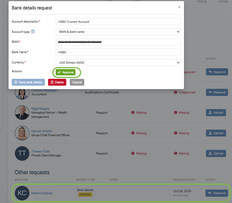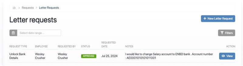 Once approved, future pay runs will automatically send the employee’s salary to the updated bank account.