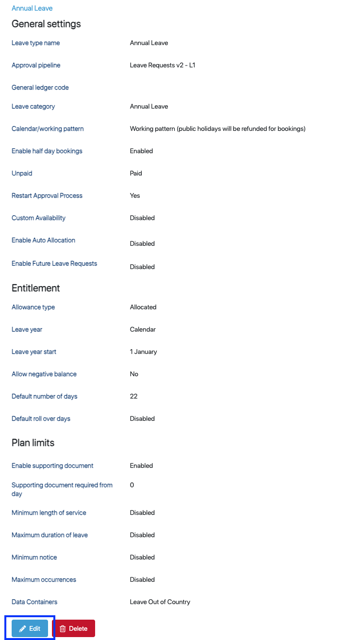 Scroll to the bottom of the Annual Leave settings and click Edit.