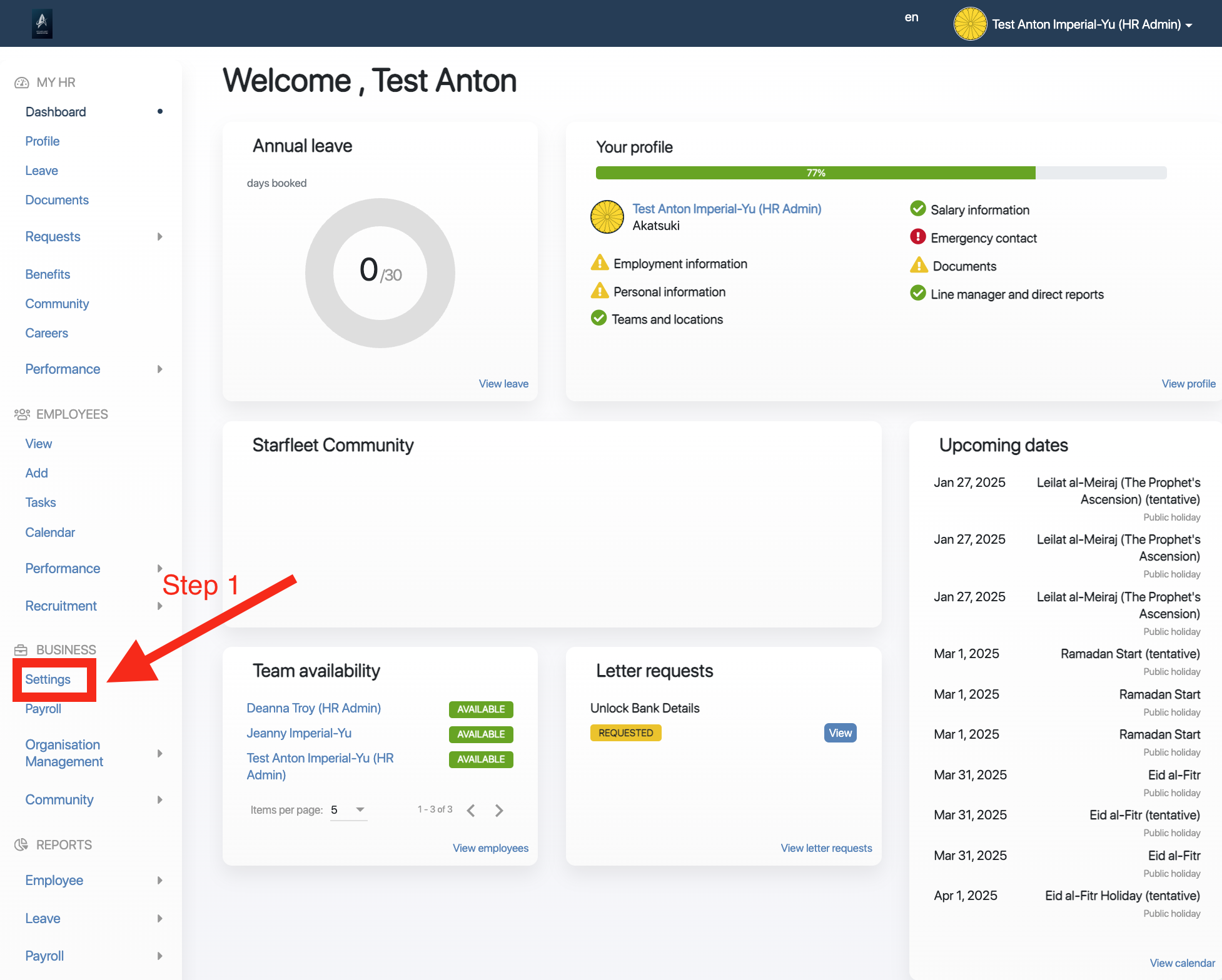 In the leave settings window, Click on Leave types.