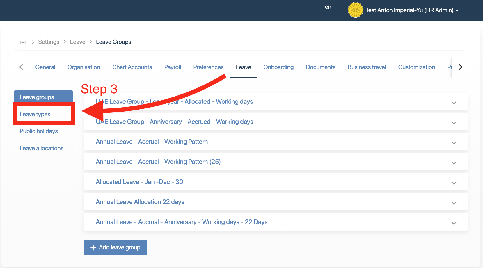 - In the leave types window, Click on the Annual leave you want to edit.