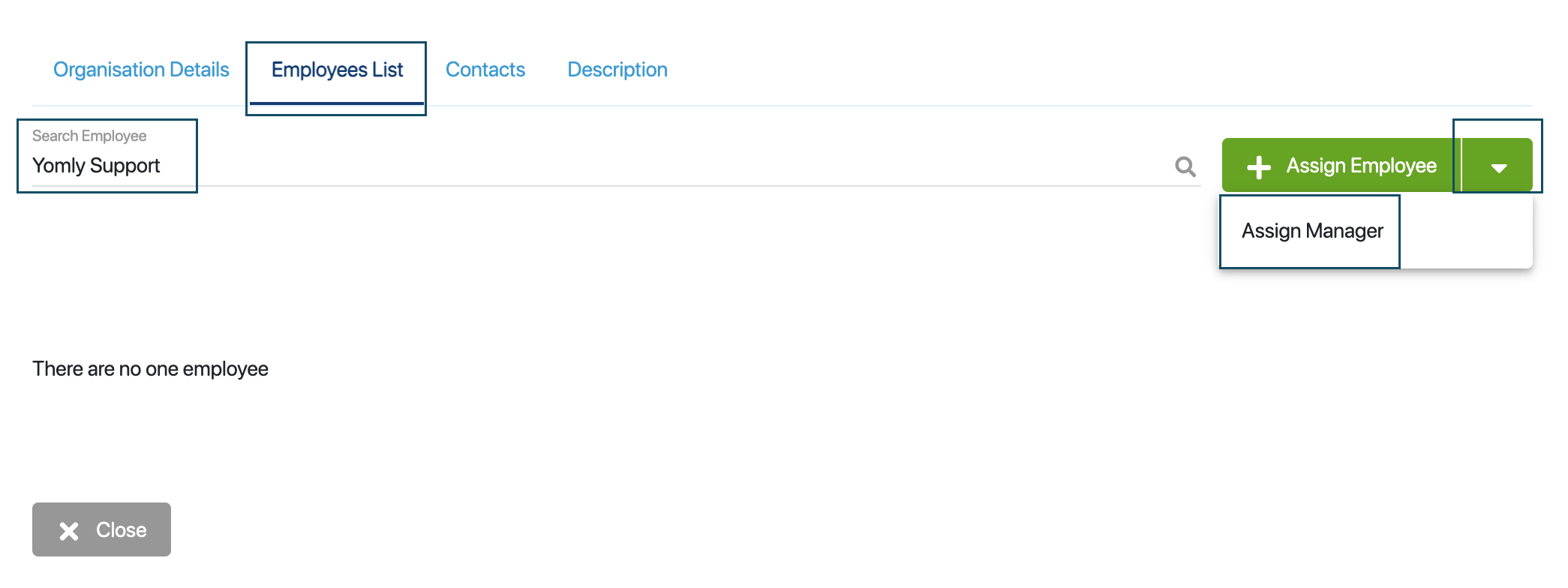 - Search for the employee by name and click on the "Down Arrow" to get the option "Assign Manager".
