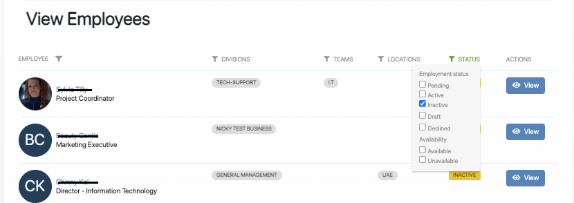 - Use the Status filter to narrow down the inactive employee list.
