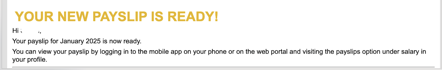 When you issue a payslip for a payrun, an email is sent to all employees notifying them that a payslip has been issued for a specific month. The email usually includes the payslip as an attachment, which can be opened using the password mentioned in the message.