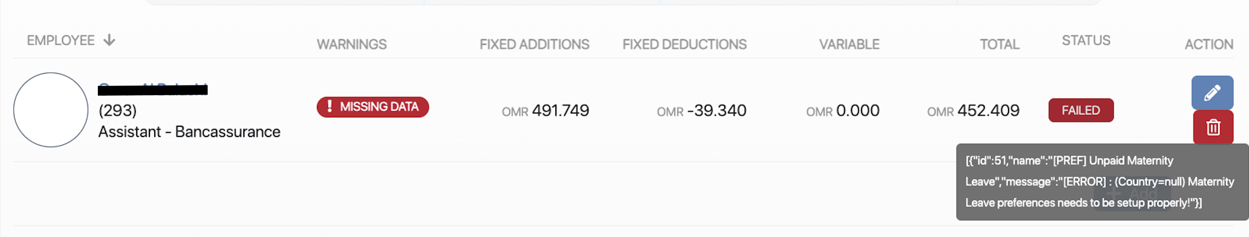 While creating or running a payrun, the system fails with the error message: