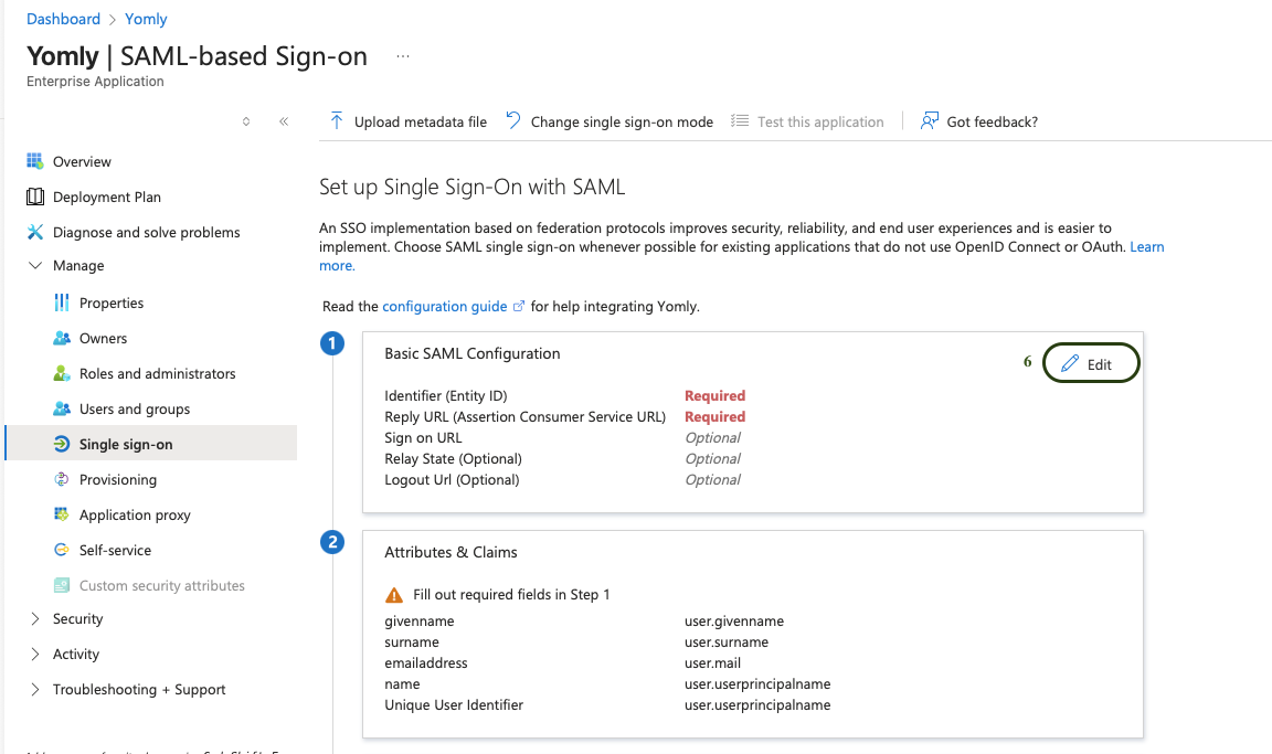 - In the SAML section, select "Basic SAML Configuration" and edit to provide the following details: