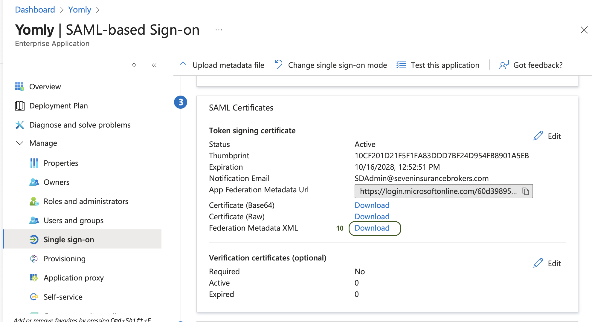- Download the Federation Metadata XML from the link under "Single sign-on" - "SAML Certificates."