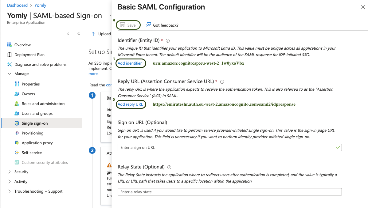Identifier (Entity ID): urn:amazon:cognito:sp:eu-west-2_1w0yxoVbx - Configure the Reply URL by adding the following: