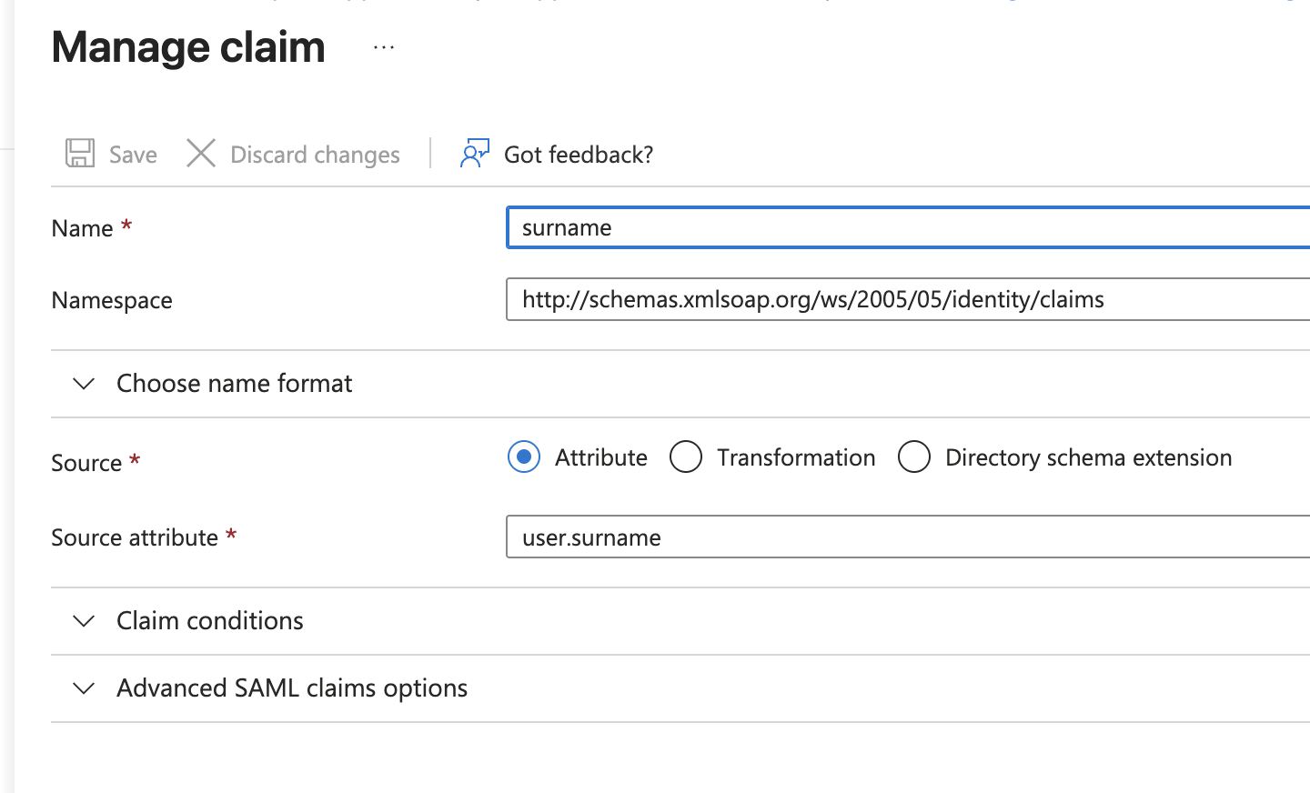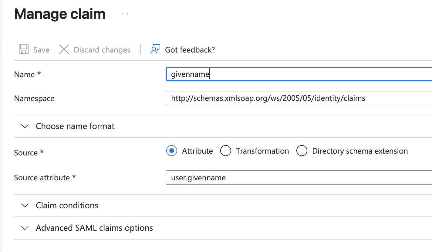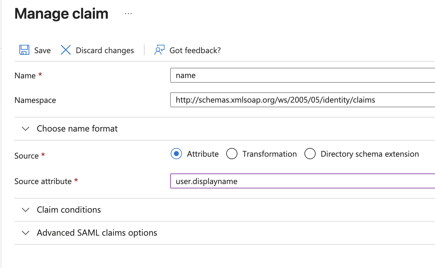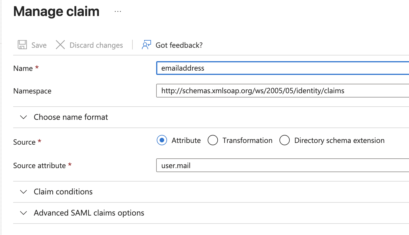 - Verify User Attributes & Claims have the default values under "Single sign-on" -> "Attributes & Claims"-> Edit :