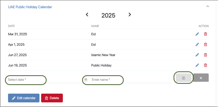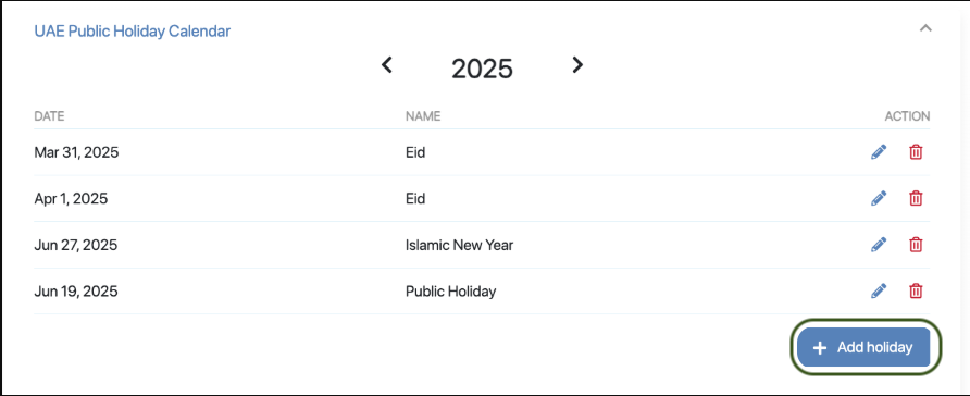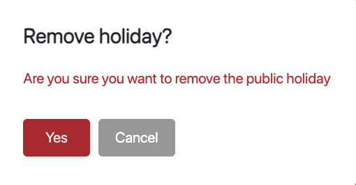 π Note: Deleting a holiday immediately removes it from the calendar and can affect employee entitlements.