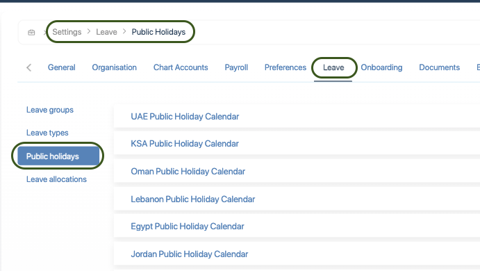 Follow the steps below to manage public holiday calendars in your Yomly system.