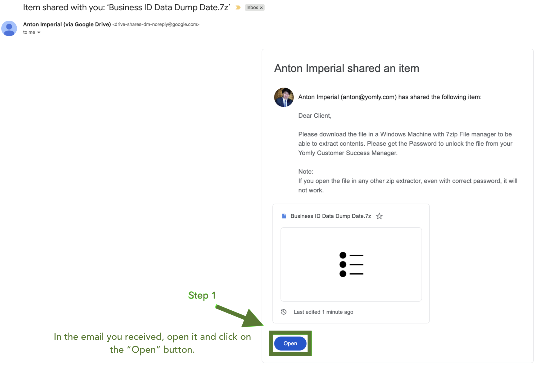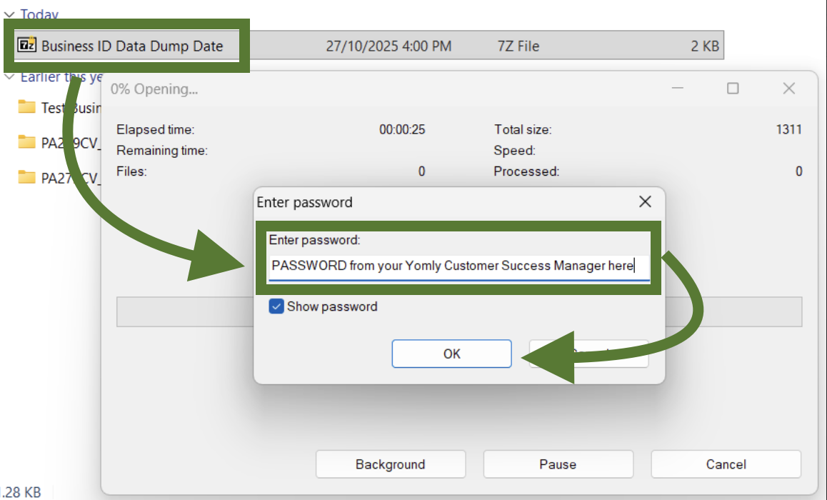The password to unlock the Data Dump will be shared with you by your Yomly Customer Success Manager.
