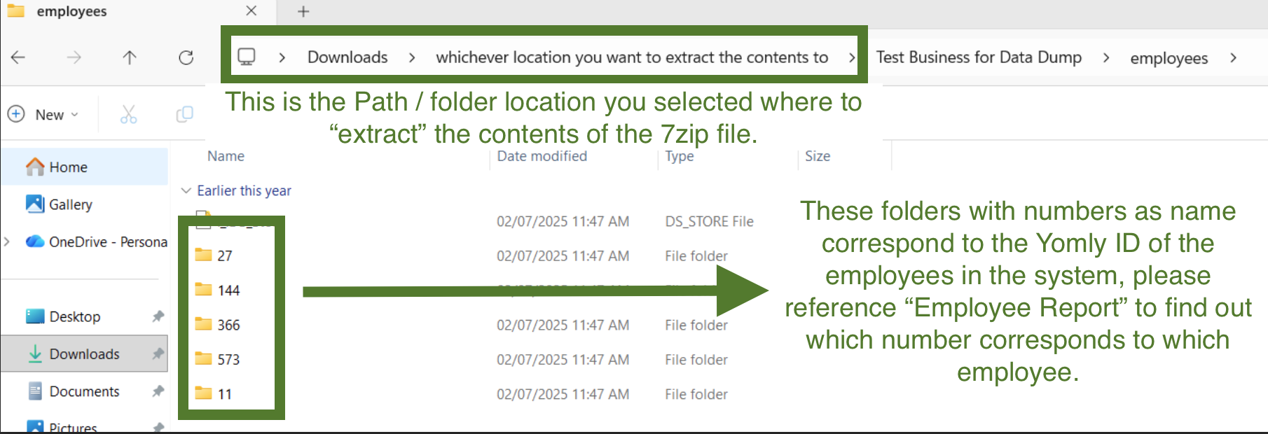 - Extracted folders will show Yomly ID numbers, please reference the Employee Report to understand which folders Yomly ID number corresponds to which employee.