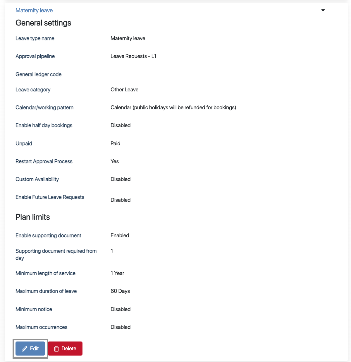 Locate the Maternity Leave type (or any leave type you want to edit). Click to expand its details.- Click on Edit