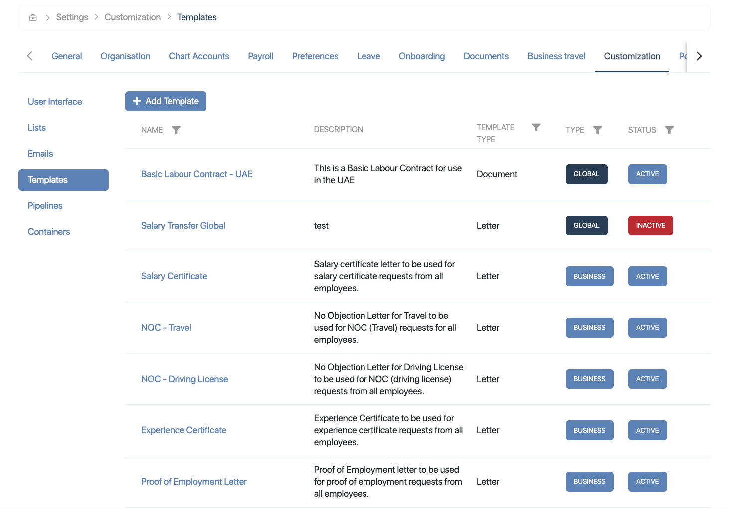 Access Requirement: Only employees with HR Admin access can manage letter template settings.