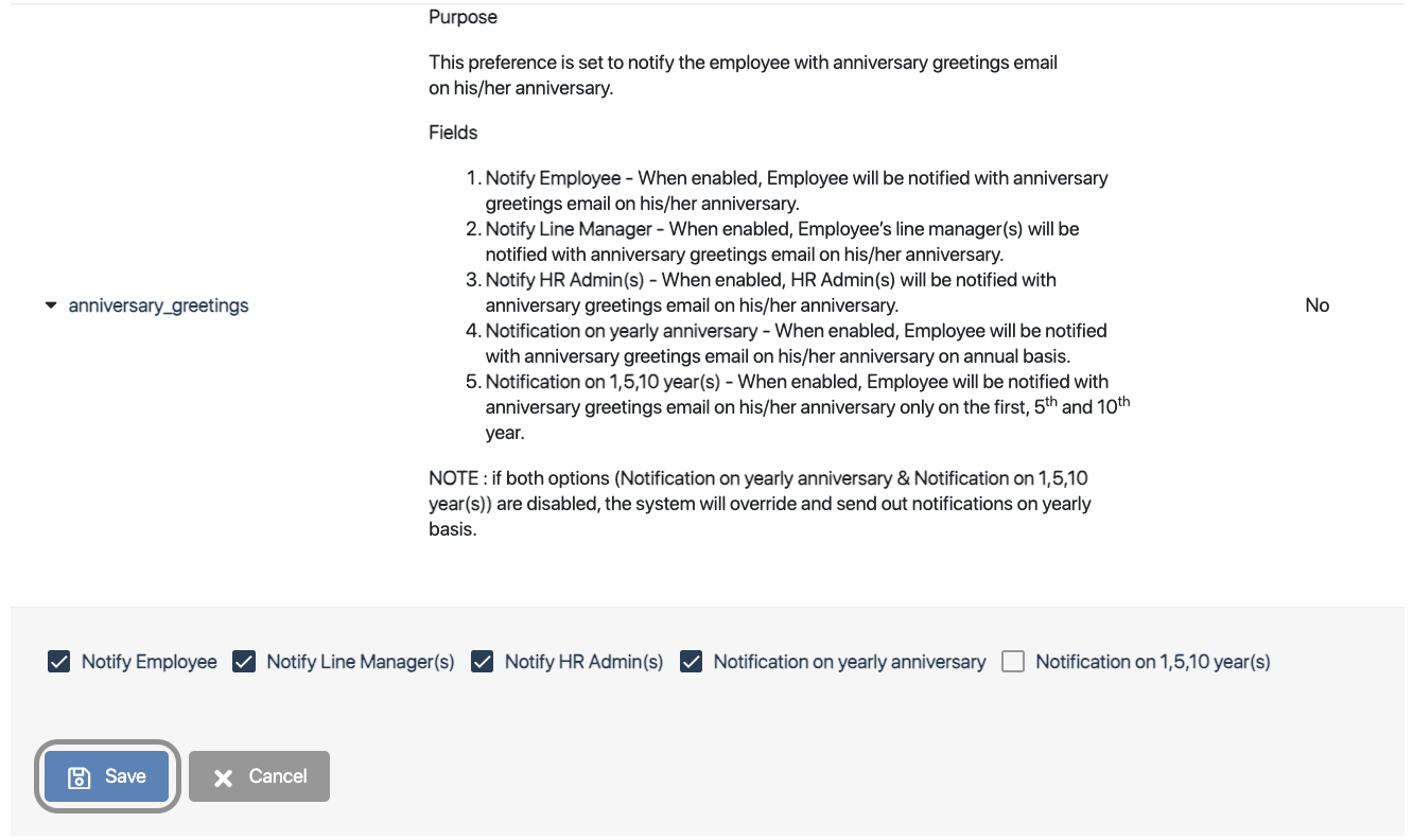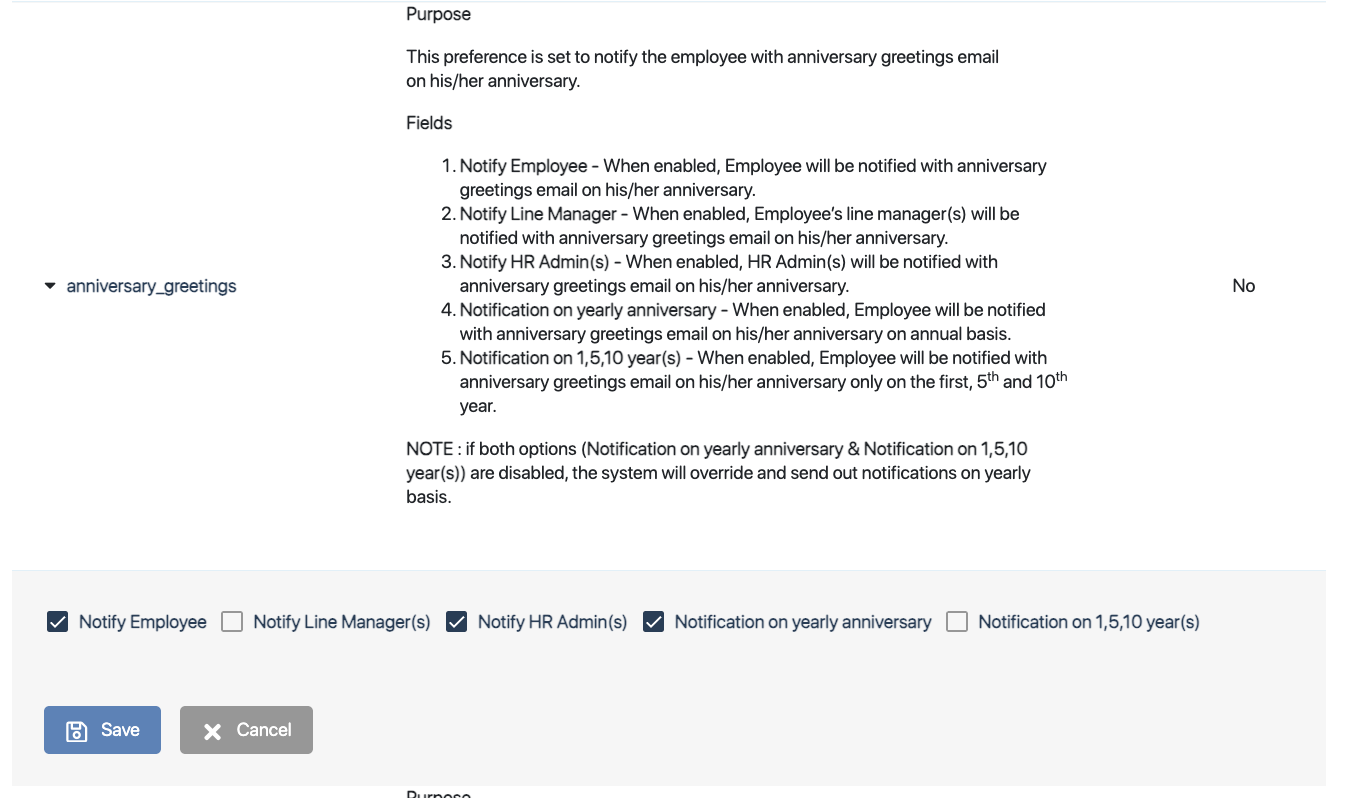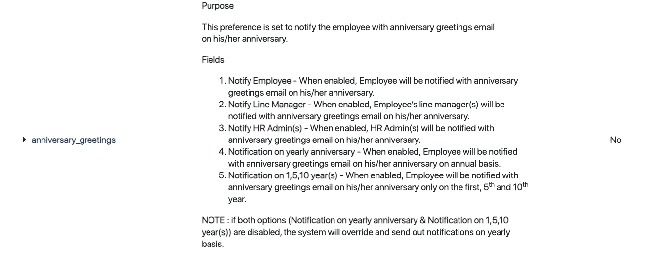 When enabled, HR Admin(s) will receive an anniversary greeting email.