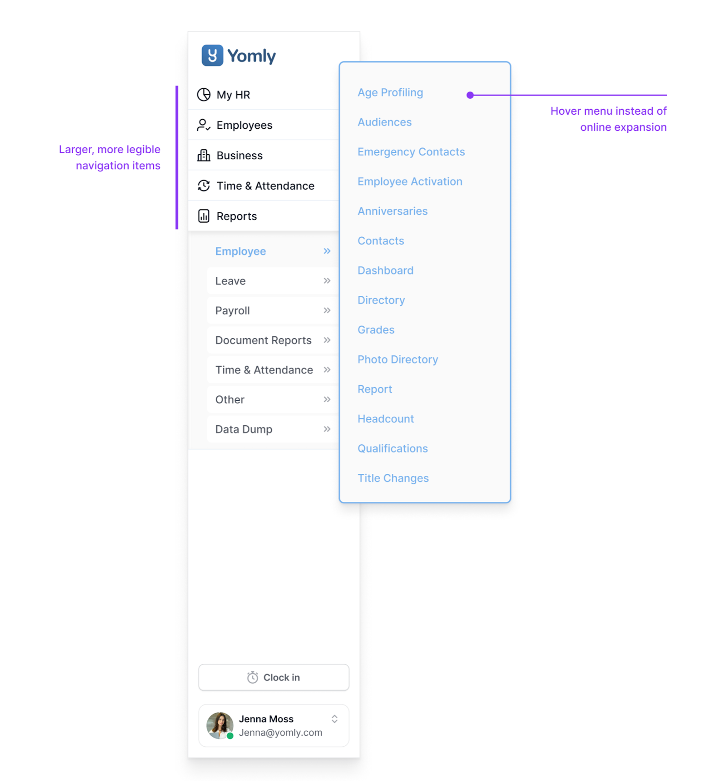 We rebuilt the left-hand navigation from the ground up using Yomly’s new design system, with a simple goal: make it easier to see, understand, and move.