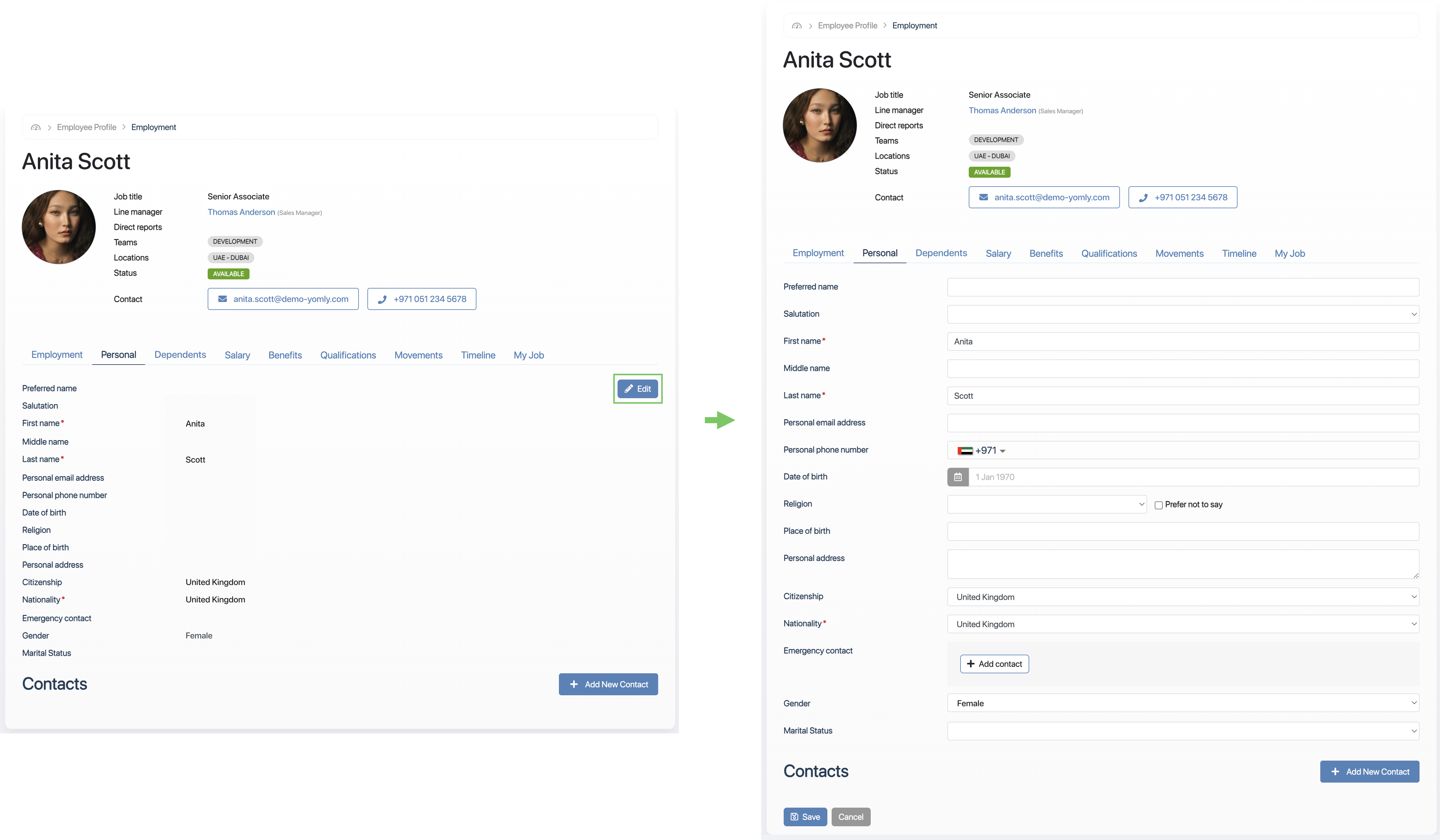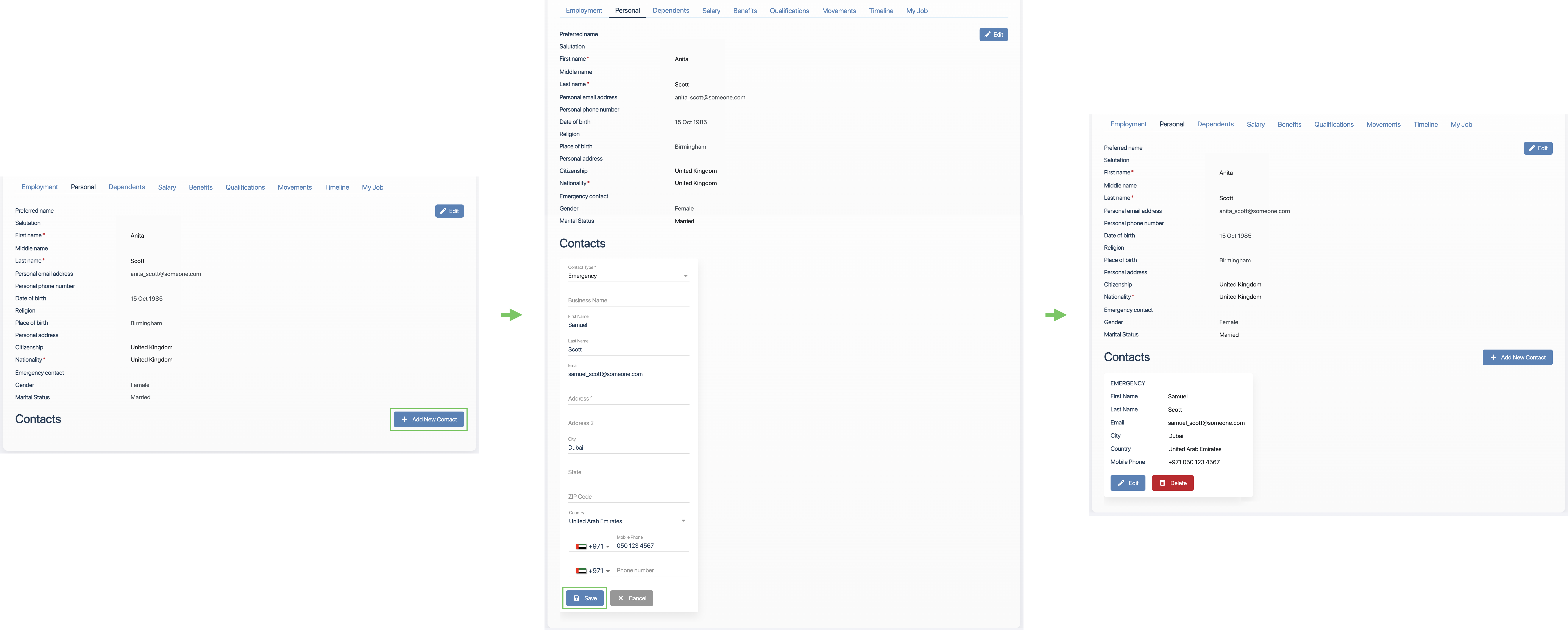 Go to the Contacts section (by scrolling to the bottom of the Personal tab).