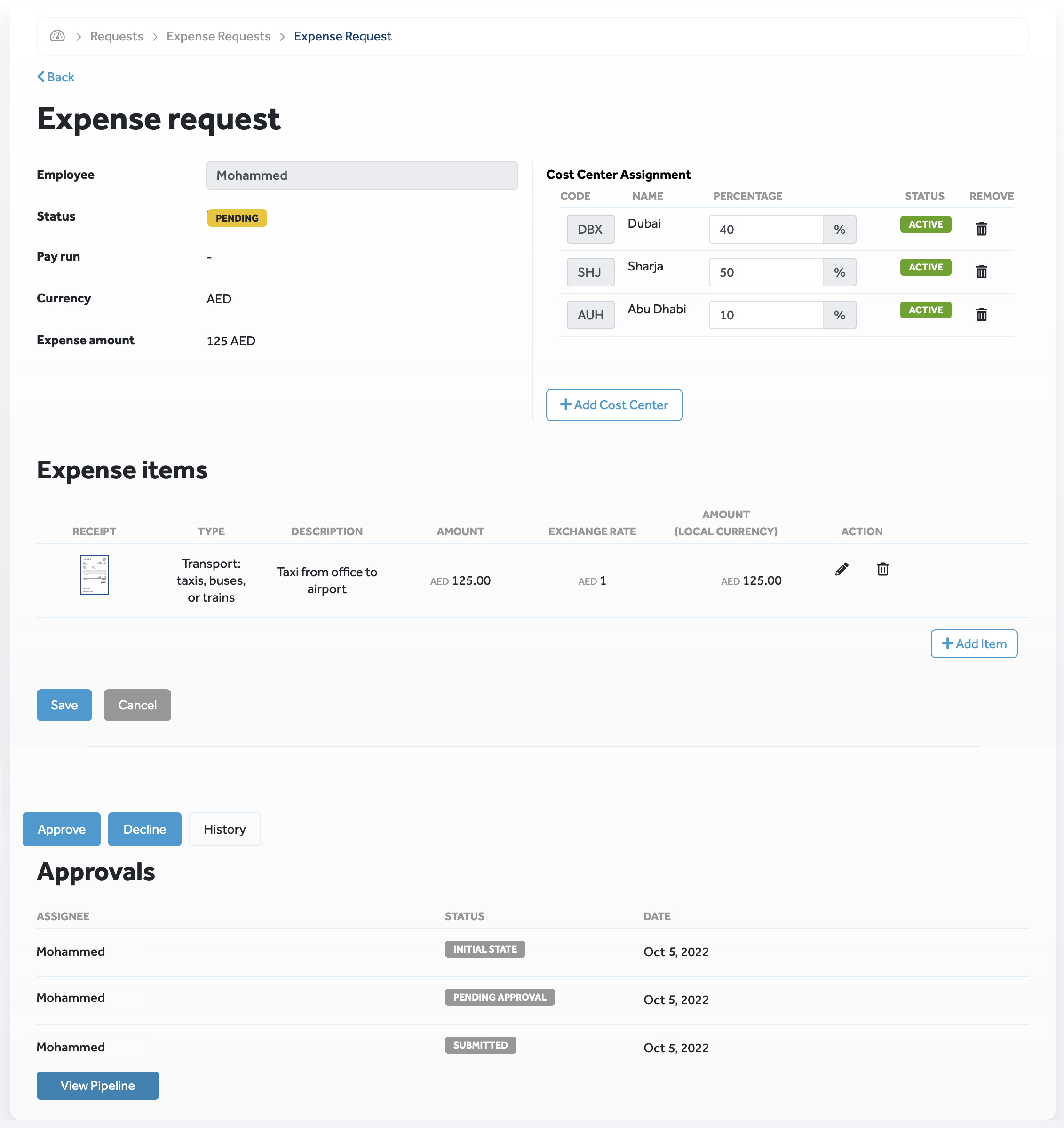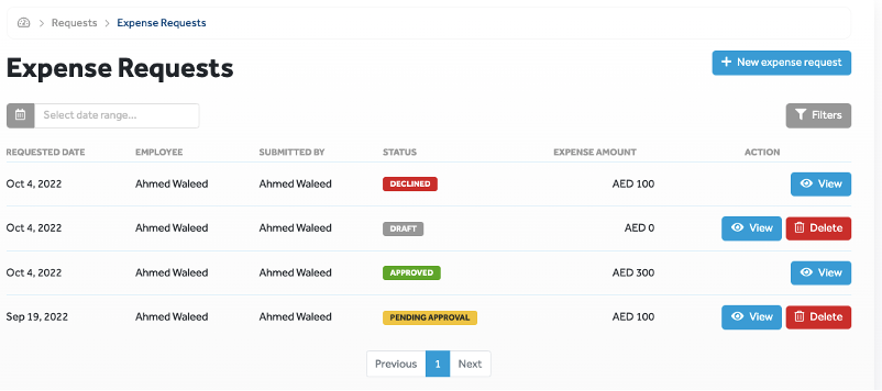 When creating, entering details, saving, and submitting expense requests, you can track its status from the Expense Request page. In the table, the Status column displays the status of each request.