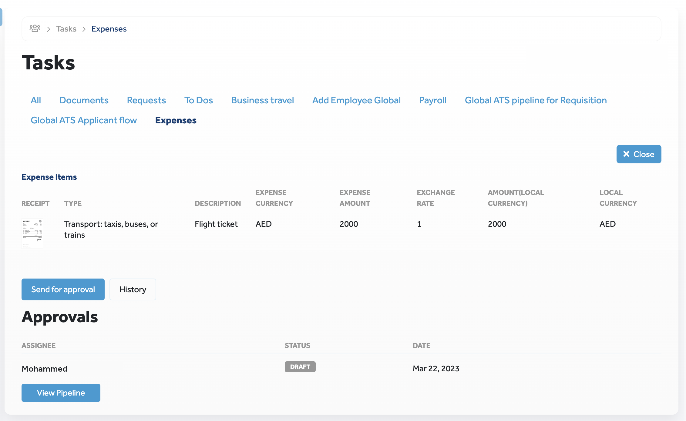 Feature UI Description Expenses The following image illustrates the buttons displayed in an expense request after it is sent for approval: