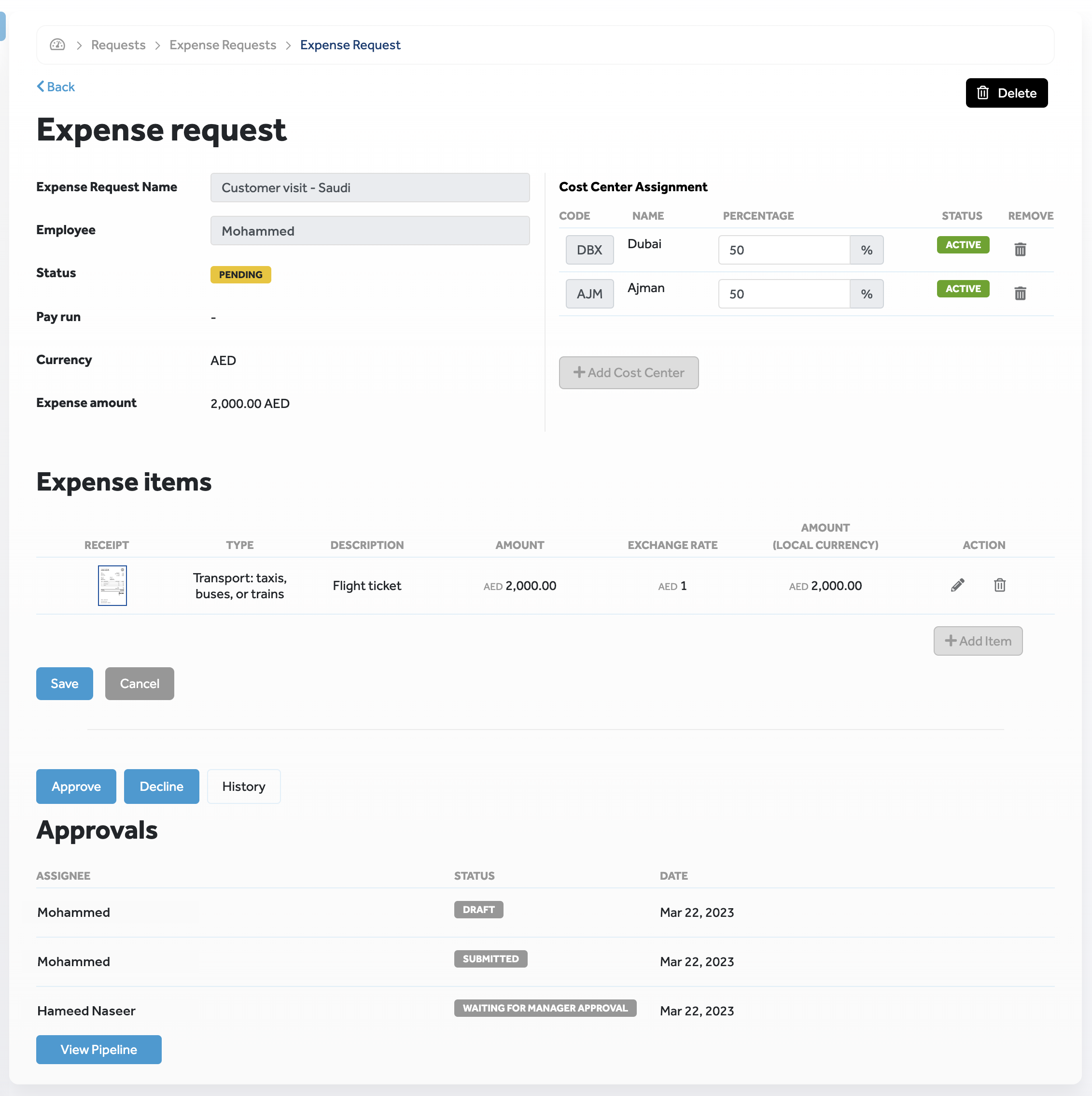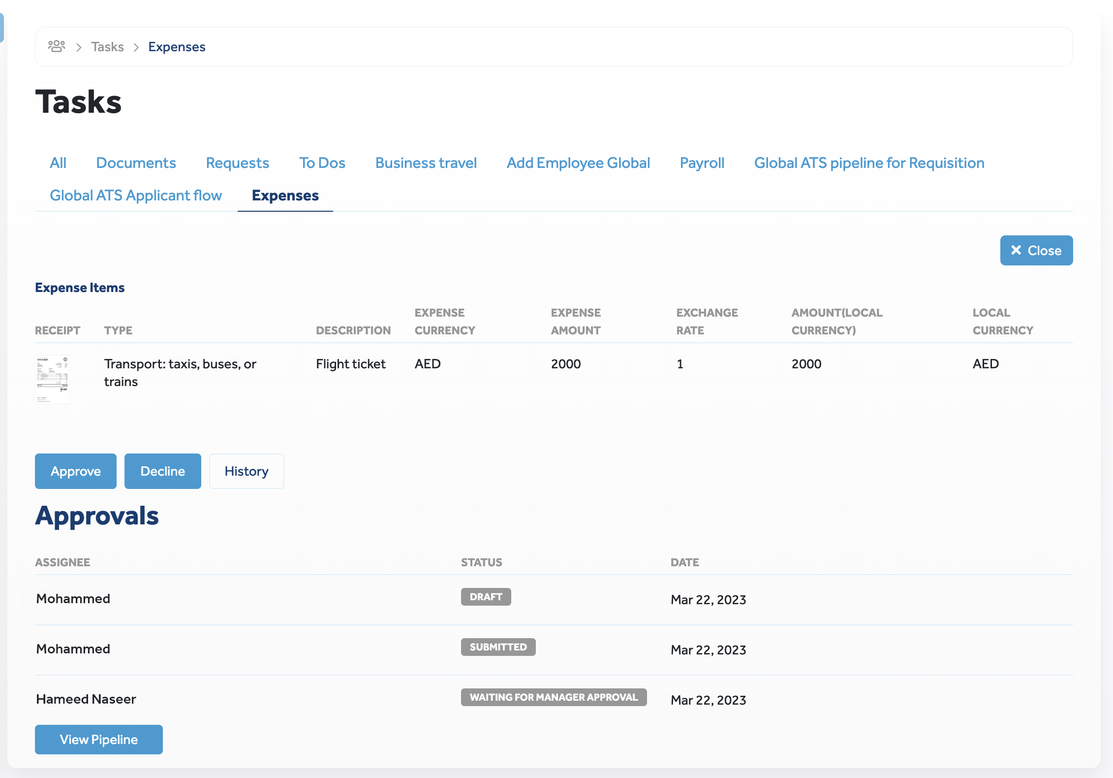 Similar to Expenses, buttons that indicate permitted actions (Approve and Decline) are displayed.