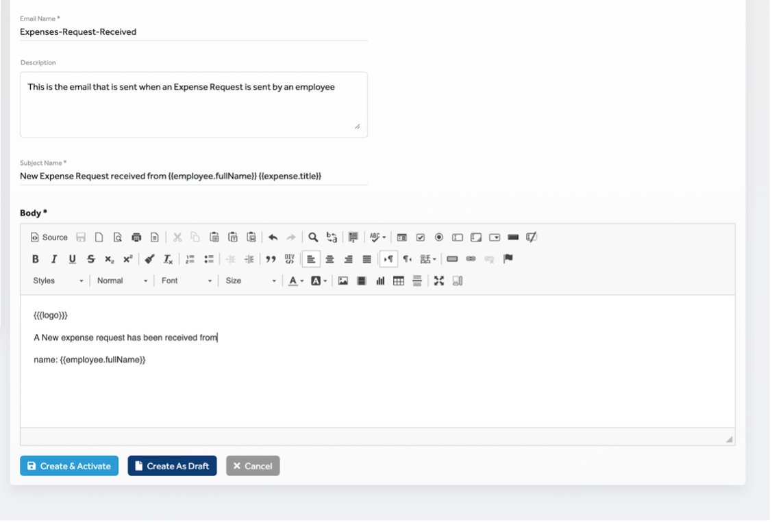 The following example illustrates how a template for expense request notification emails to managers would look: |